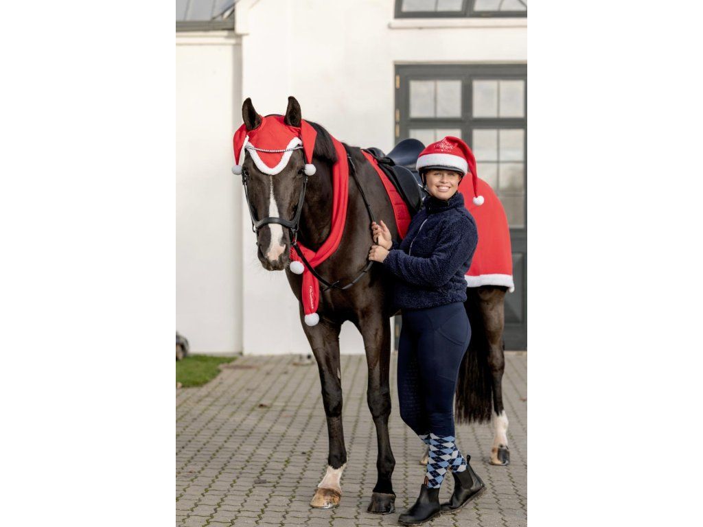 Vánoční čabraka pro koně s čepičkou a sobími parohy okouzlí každého milovníka Vánoc. Snadné upevnění pomocí šňůrky s otvory na uši.