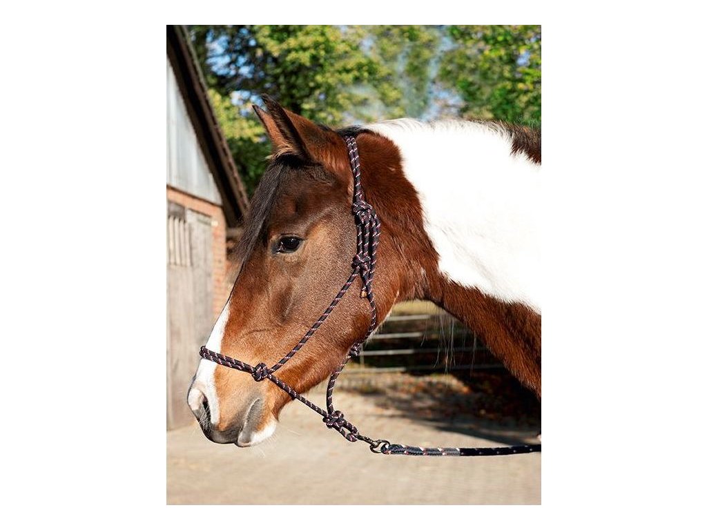 Set kvalitní provazové ohlávky s vodítkem. Ohlávka je vhodná na práci ze země i na ježdění. Velikost je možné nastavit podle potřeby. Ohlávka je dodávána s vodítkem o délce 3,7 metru. Vodítko je vybaveno klasickou karabinou se stříbrným kováním a koženým koncem.