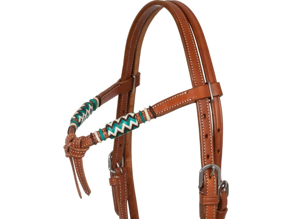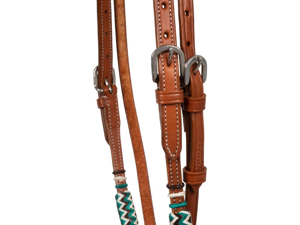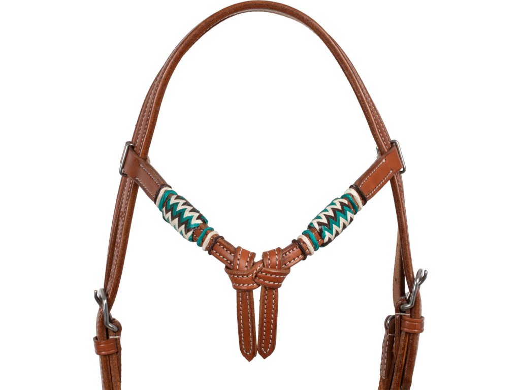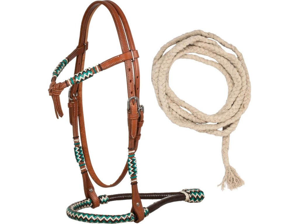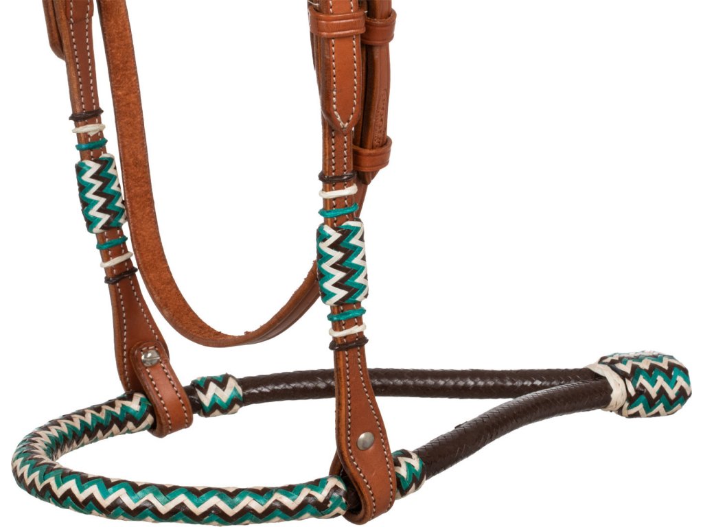Uzdečka bosal vyrobená z měkké kvalitní kůže. Ideální pro všechny typy práce, pro každodenní použití při tréninku a závodech. Vybavená přezkami z nerezové oceli, které zajišťují větší pevnost a stabilitu a působí elegantně a funkčně zároveň. Čelenku zdobí pestrobarevný tkaný vzor a středová vazba na přední straně, které uzdečce dodávají nádech elegance a originality. Dodávaná včetně bavlněných mecate otěží.