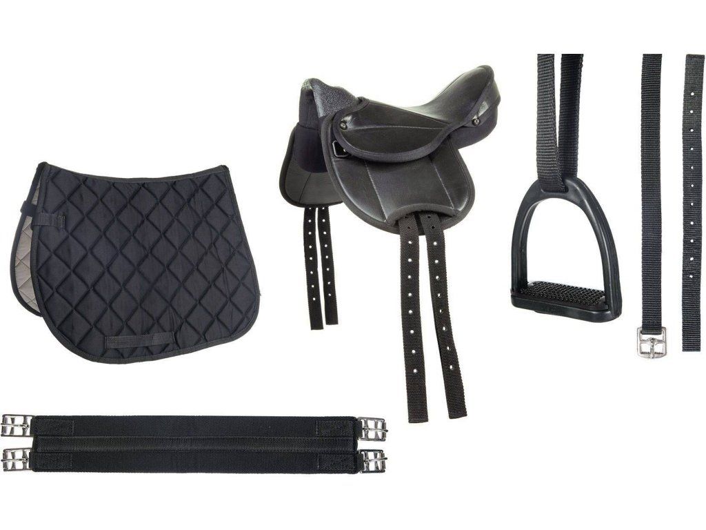 Dětský kompletní set pro shetland poníky zahrnující sedlo, dečku, podbřišník, třmeny a třmenové řemeny. Sedlo je velmi lehké, vyrobeno z umělé kůže. K dispozici ve více barevných variantách.