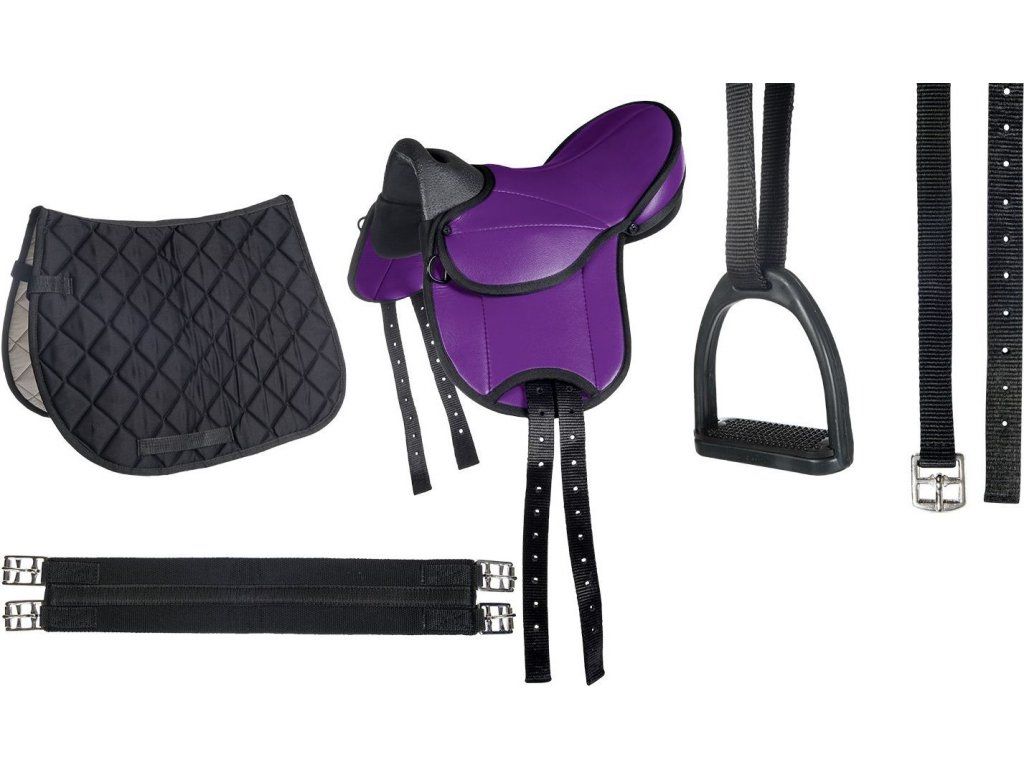 Dětský kompletní set pro shetland poníky zahrnující sedlo, dečku, podbřišník, třmeny a třmenové řemeny. Sedlo je velmi lehké, vyrobeno z umělé kůže. K dispozici ve více barevných variantách.