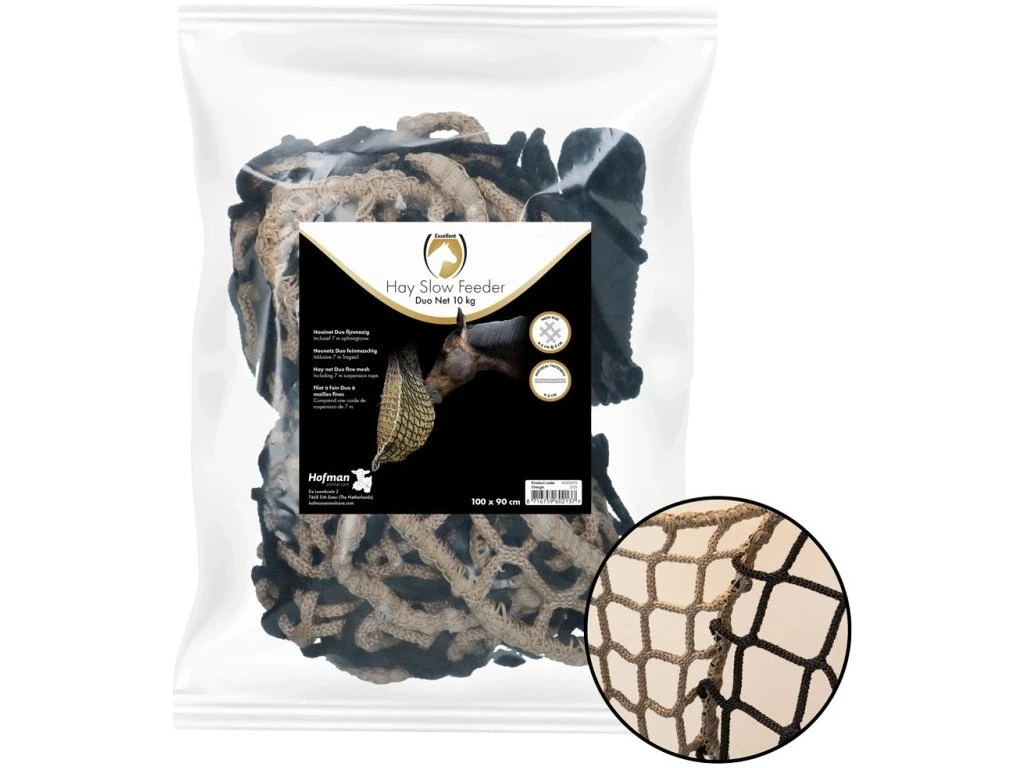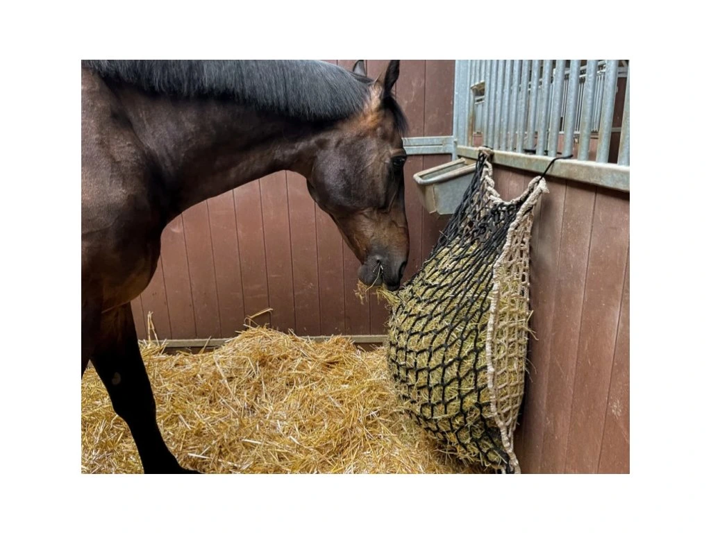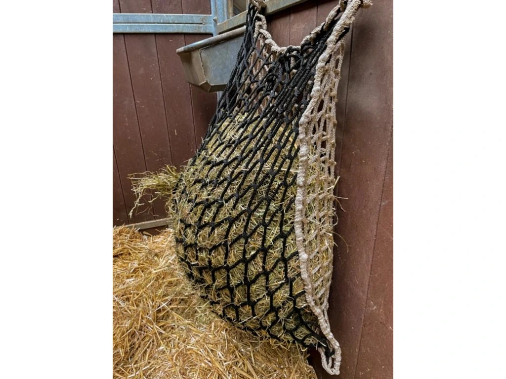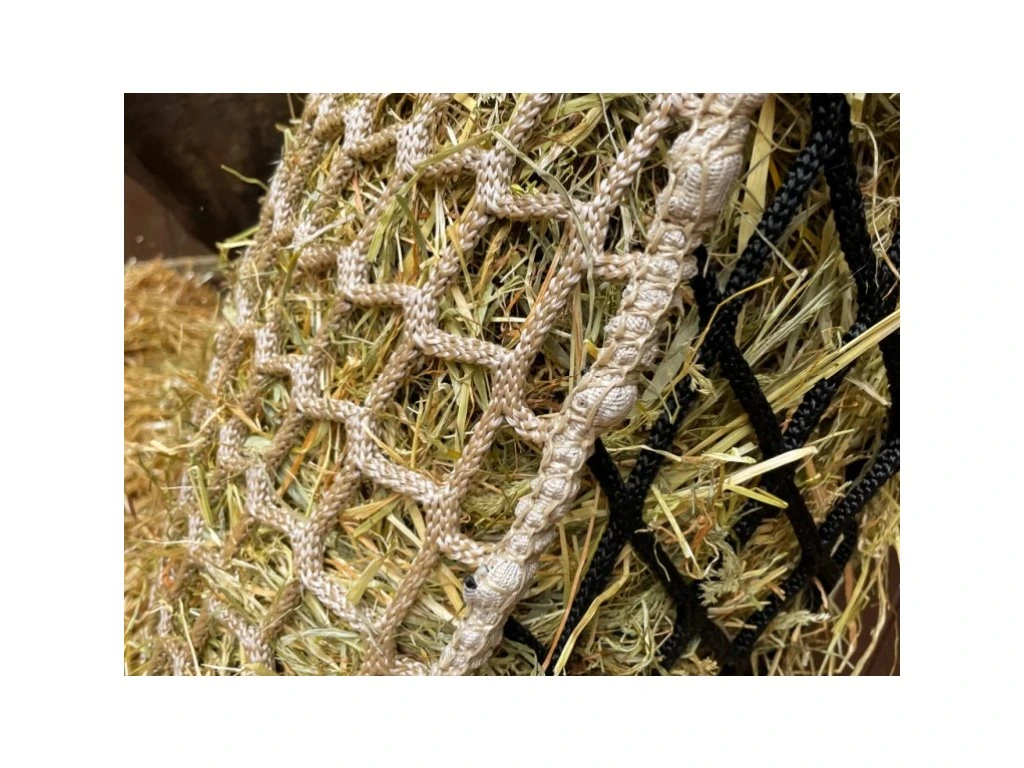 Extrémně pevná síť na seno pro koně vyráběná firmou, která vyrábí sítě a lana pro lodní dopravu. Je vyrobena z velmi pevného materiálu (polypropylen) a bez uzlíků. Kombinovaná síť ze dvou různých dílů. Jedna strana má oka o rozměru 6 cm, druhá strana má oka o rozměru 4,5 cm. Ještě nikdy jsme neměli v ruce takto pevnou síť na seno, tohle je opravdu držák!