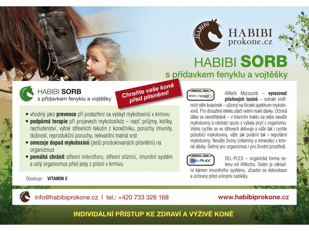 HABIBI-SORB. Chraňte Vašeho koně před plísněmi! Pomáhá omezit dopad mykotoxinů a chránit střevní mikroflóru, střevní sliznici, imunitní systém a celý organismus před jedy z plísní v krmivu. Dostupné v množství 1kg, 2,5kg, 4kg, 10kg/664 dní. Pomáhá omezit dopad mykotoxinů – jedů produkovaných plísněmi Pomáhá chránit střevní mikroflóru, střevní sliznici, imunitní systém a celý organismus před jedy z plísní v krmivu Velmi rychle se ve střevech aktivuje a váže tak i rychle působící mykotoxiny, váže jak polární tak i nepolární mykotoxiny. Neváže živiny (vitamíny a minerály) z krmné dávky. Pro dosažení efektu stačí velmi malé dávky. Účinná látka se nevstřebává - v trávicím traktu na sebe naváže mykotoxiny a odchází spolu s výkaly pryč z organizmu. Šetrný pro organizmus i pro životní prostředí. Habibi-sorb je vyroben z vyvazovače nejnovější generace - Mycosorbu - mezinárodní společnosti Alltech, která je jedničkou ve výzkumu problematiky plísní, jejích jedů (mykotoxinů), jejich vyvazování a účinků na organismus. Dávkování: 15 – 30 g na koně a den. 15 g na koně a den preventivně. 30 g na koně a den při podezření na výskyt plísní a jejich mykotoxinů v krmivu a při mykotoxikózách. Ideálně rozdělit do více krmných dávek během dne. Vhodné pro všechny věkové kategorie koní včetně březích a kojících klisen a hříbat.Doplňkové parametry