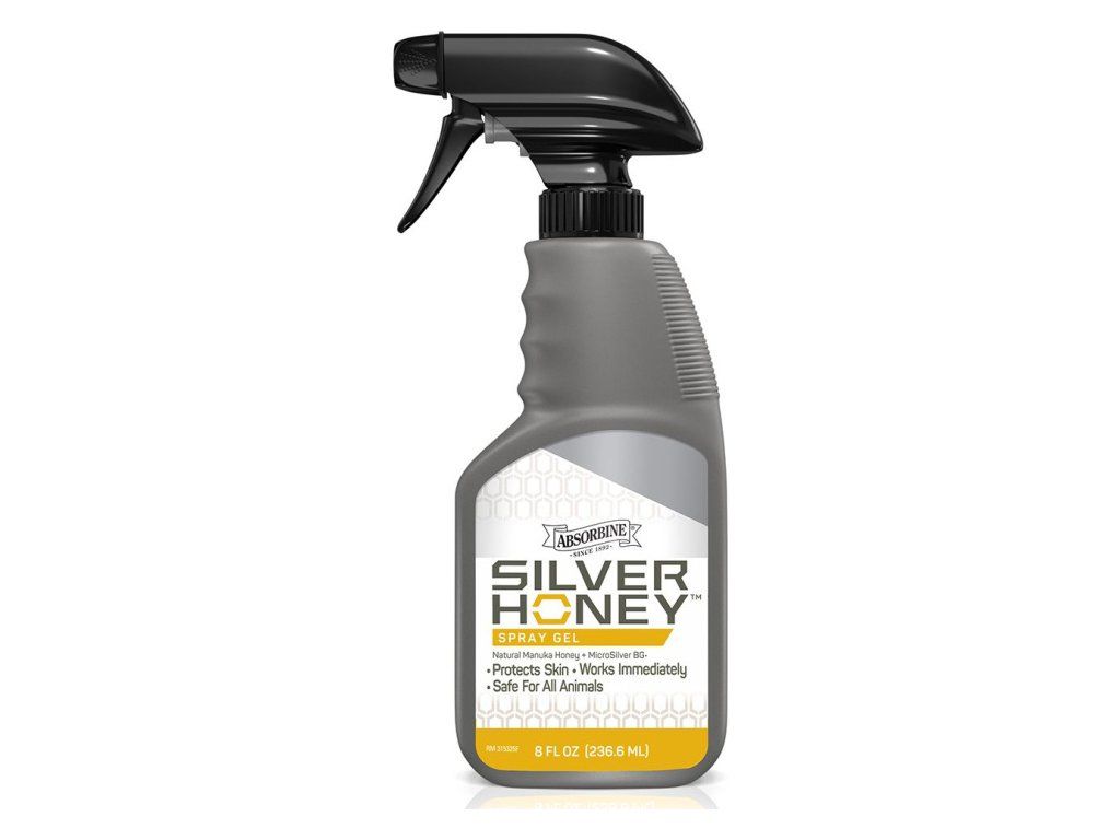 Absorbine Silver honey spray je pH neutrální, neobsahuje kyselinu chlornou a lze jej použít pro koně, psy a všechny druhy zvířat.