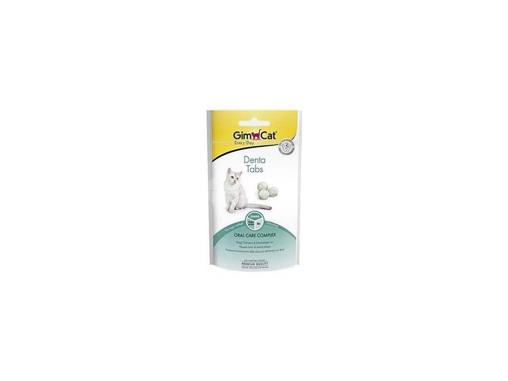 Gimcat Denta tabs: tablety na čištění zubů u koček. GimCat Denta Tabs obsahují cenná čisticí tělíska z celulózy, která pomáhají odstraňovat zubní povlak. Hexafosfát sodný zamezuje tvorbě zubního kamene. Mořské řasy posilují zuby a máta zlepšuje dech. Složení: mléko a výrobky z mléka, oleje a tuky, kvasnice, řasy (sušené 6%), máta sušené (4%), výrobky z rostlin (3% celuloza) minerální látky, natriumhexafosfát 0,6%. Protein 21,5%, tuk 18,5%, vláknina 9%, popel 8%, vhlkost 5%.