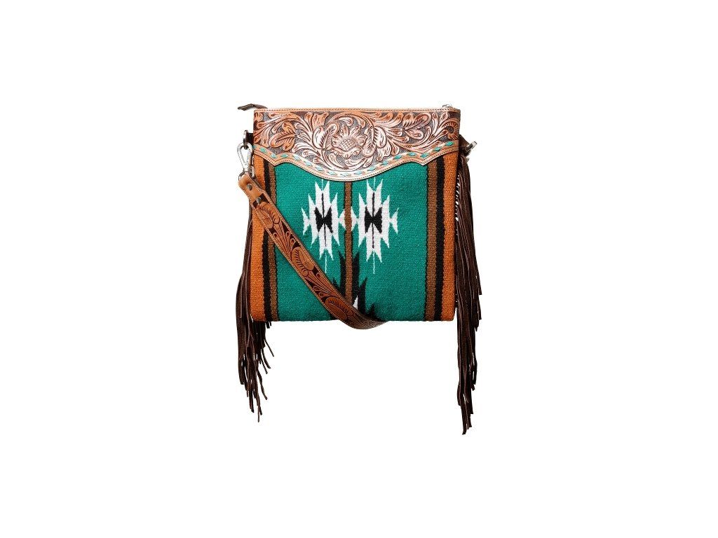 Nádherná boho taška přes rameno z ručně děrované hovězí kůže s tyrkysovou textilní vložkou a třásněmi. Odnímatelný ramenní popruh. Díky výrazným barevným akcentům v aztéckém stylu upoutá pozornost. Rozměry cca 38 x 35,6 cm.