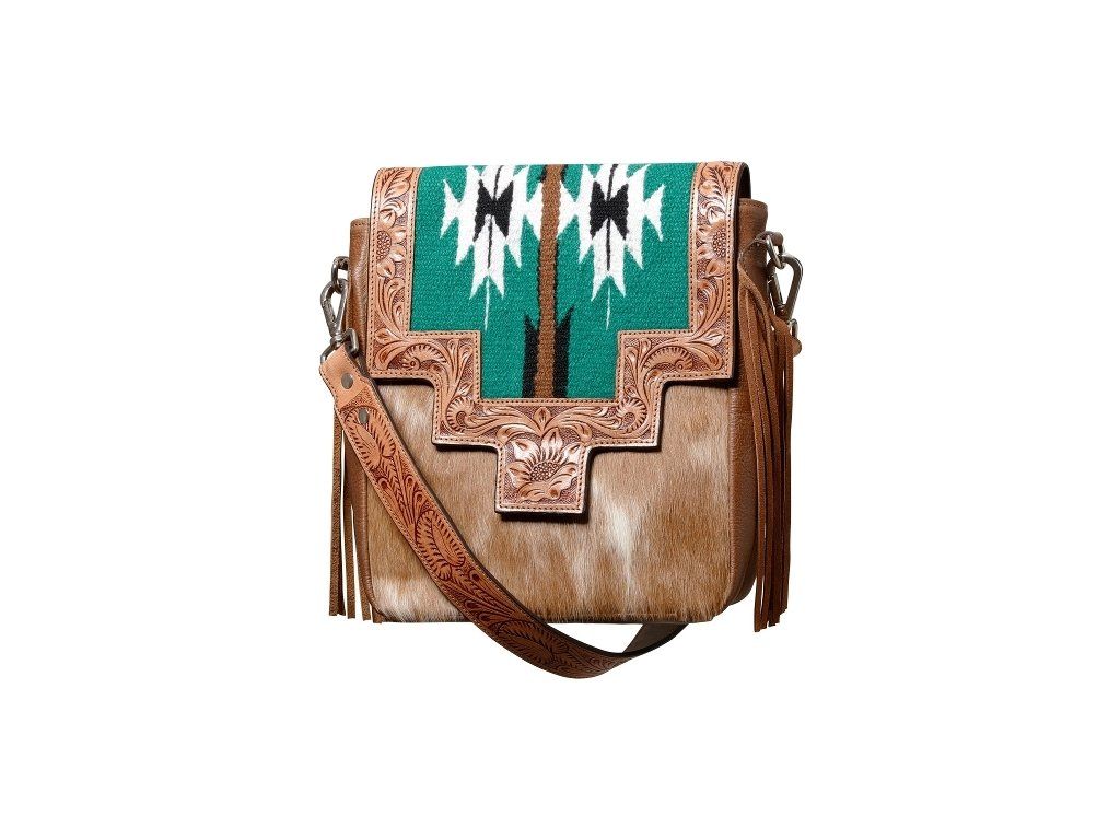 Nádherná boho taška přes rameno z ručně dírkované hovězí kůže s tyrkysovou textilní vložkou a stylovými třásněmi. Odnímatelný ramenní popruh. Díky výrazným barevným akcentům v aztéckém stylu upoutá pozornost. Rozměry cca 25,4 x 22,9 cm.