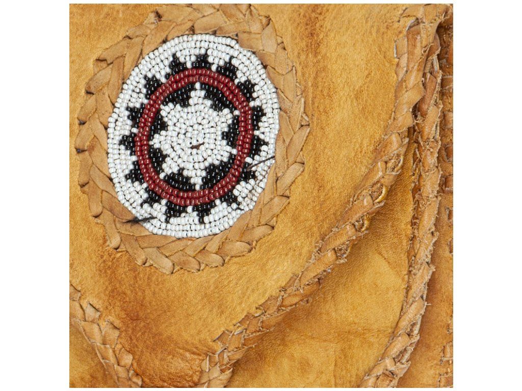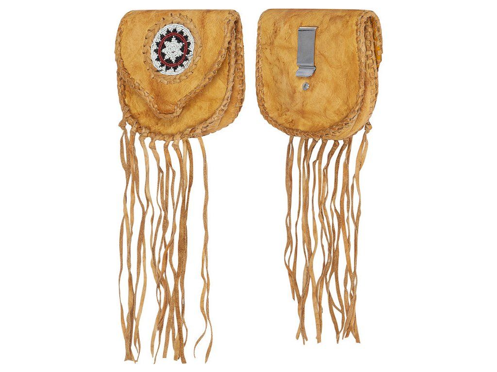 Malá praktická taštička na opasek. Vyrobena je z kvalitního koženého materiálu s barevnými akcenty a třásněmi. Vzhled tašky je doplněný idiánským motivem a stylovým šněrováním....