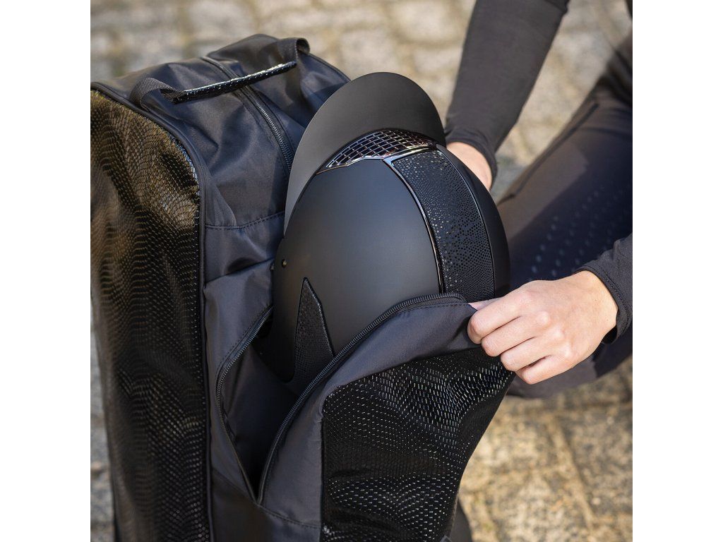 Praktická a odolná taška, která je ideální pro uložení helmy a jezdeckých bot, zdobená elegantním krokodýlím potiskem. Je vybavena pevnou rukojetí, ramenním popruhem pro pohodlné nošení a také samostatnou kapsou na bičík. Ventilační otvory zajišťují správnou cirkulaci vzduchu a zapínání na dva zipy umožňuje snadný a rychlý přístup k obsahu.
