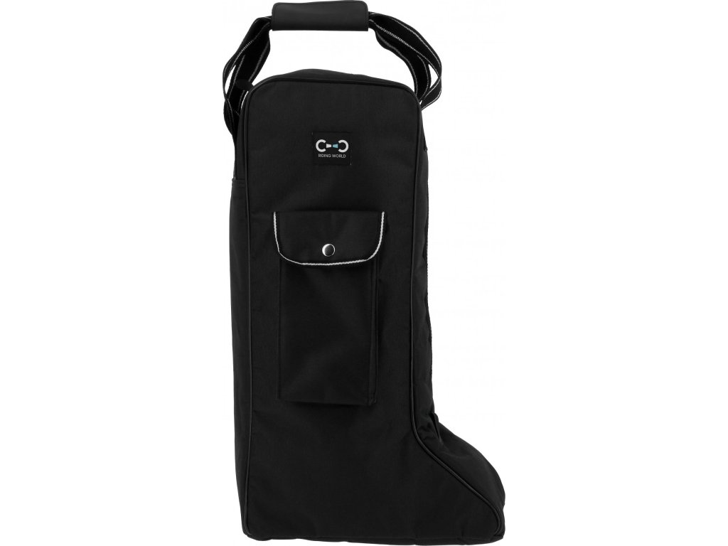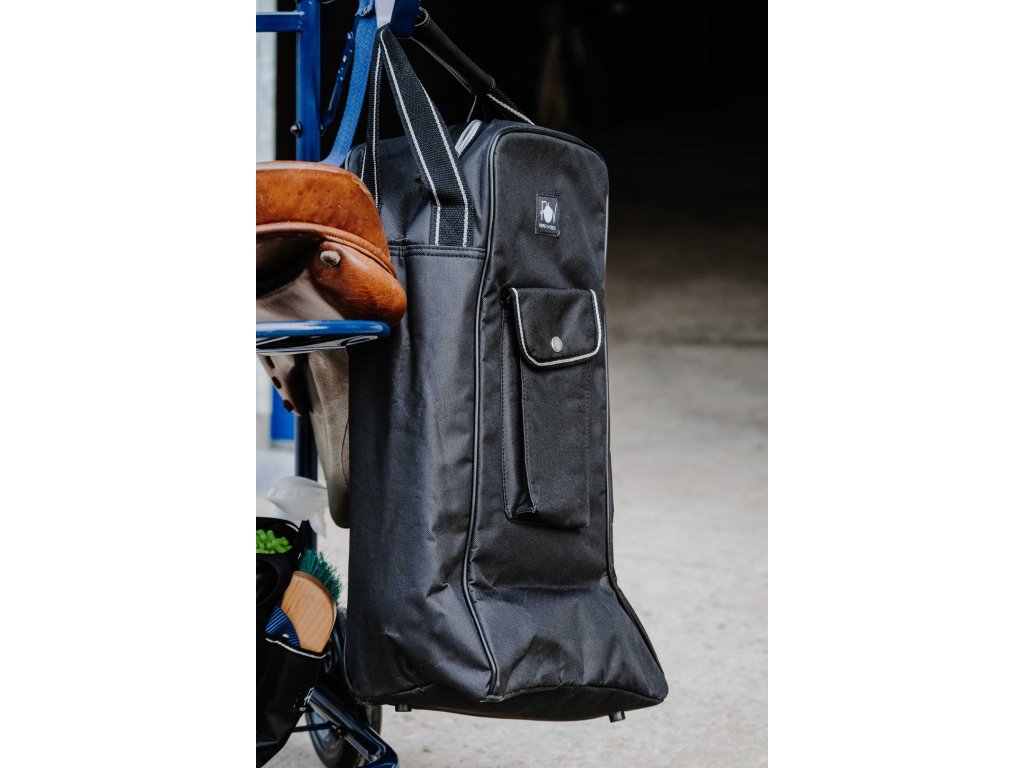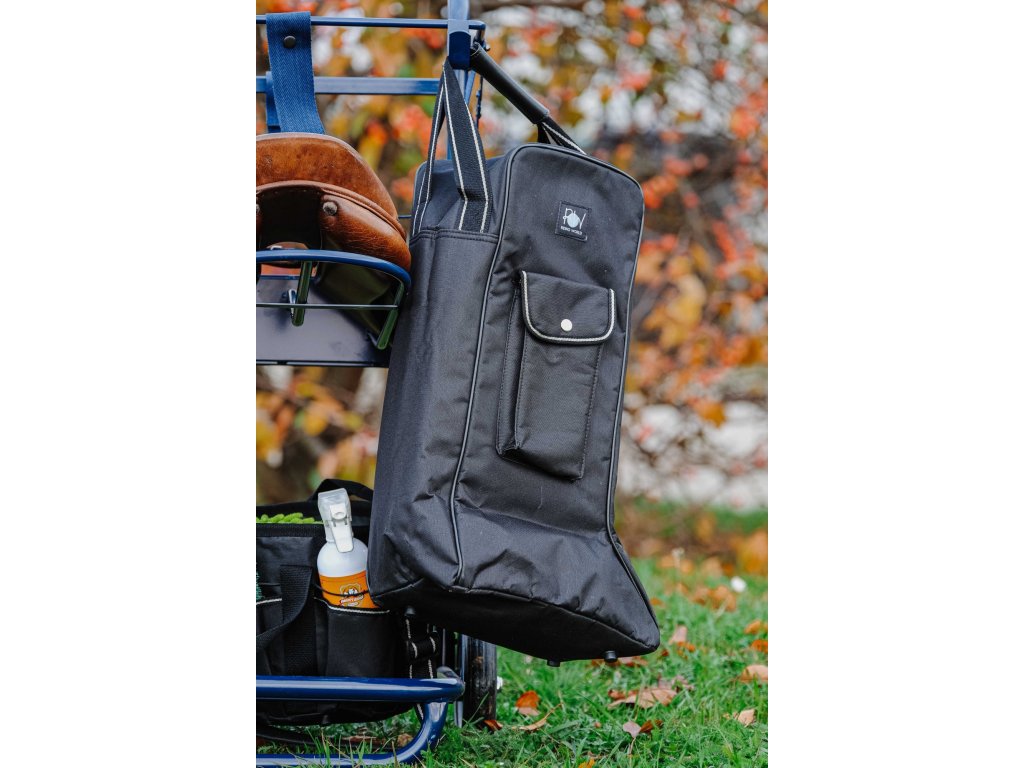 Praktická taška určená pro bezpečné uložení a přenášení vysokých jezdeckých bot. Je vyrobena z pevného a odolného nylonu a je vybavena zapínáním na zip. Dvě robustní nylonové rukojeti zajišťují pohodlné nošení. Spodní část je opatřena čtyřmi plastovými nožičkami, díky kterým lze tašku položit na zem, aniž by se ušpinila. Na boku se nachází malá kapsa na drobnosti se zapínáním na druk.