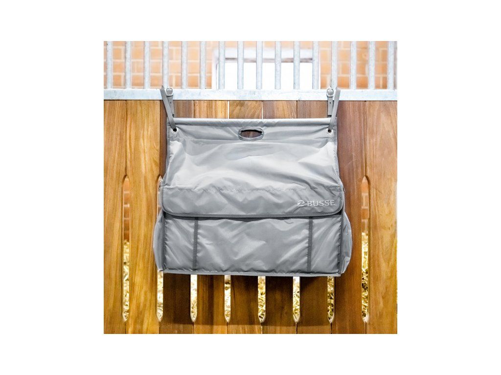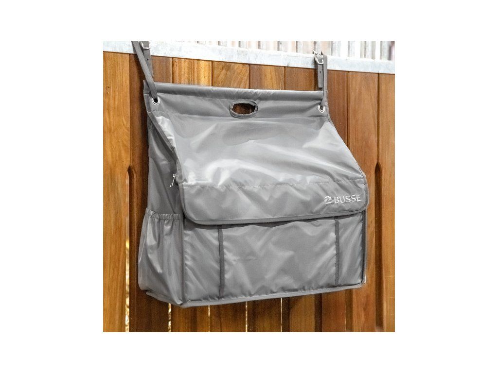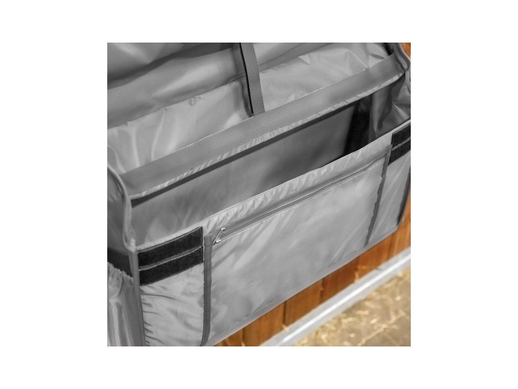 Prostorná závěsná taška pro čisté a přehledné uložení například dek, obvazů, kamaší, zvonů, čištění, ohlávek, krémů atd. Lze flexibilně a rychle připevnit pomocí popruhů, například na tyče čela boxu. Zapínání tašky pomocí zipu a suchého zipu. Prostorná vnitřní část se zesílenými stěnami a nastavitelnou přepážkou. Dvě praktické vnější přihrádky a také vnější kapsa na zip. Snadná manipulace díky rukojeti. Vyrobeno z odolného polyesterového materiálu, který se snadno udržuje.