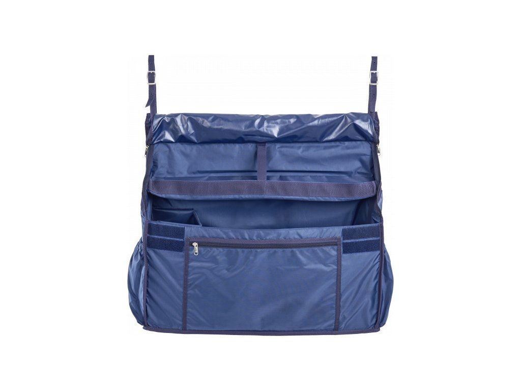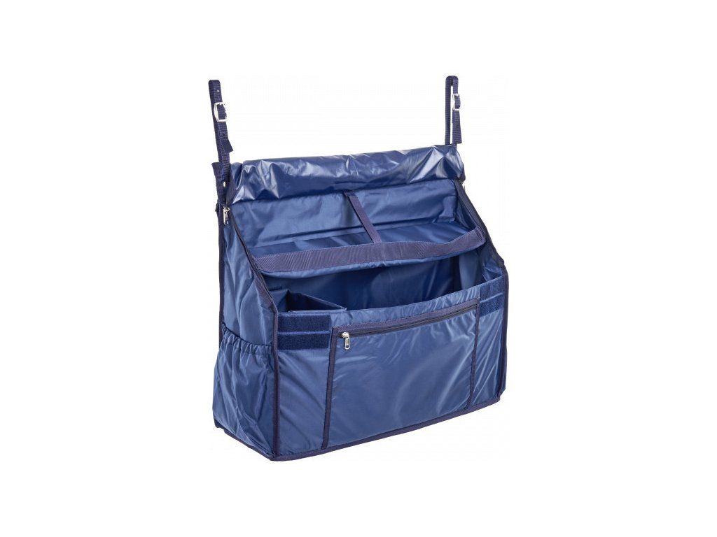 Prostorná závěsná taška pro čisté a přehledné uložení například dek, obvazů, kamaší, zvonů, čištění, ohlávek, krémů atd. Lze flexibilně a rychle připevnit pomocí popruhů, například na tyče čela boxu. Zapínání tašky pomocí zipu a suchého zipu. Prostorná vnitřní část se zesílenými stěnami a nastavitelnou přepážkou. Dvě praktické vnější přihrádky a také vnější kapsa na zip. Snadná manipulace díky rukojeti. Vyrobeno z odolného polyesterového materiálu, který se snadno udržuje.