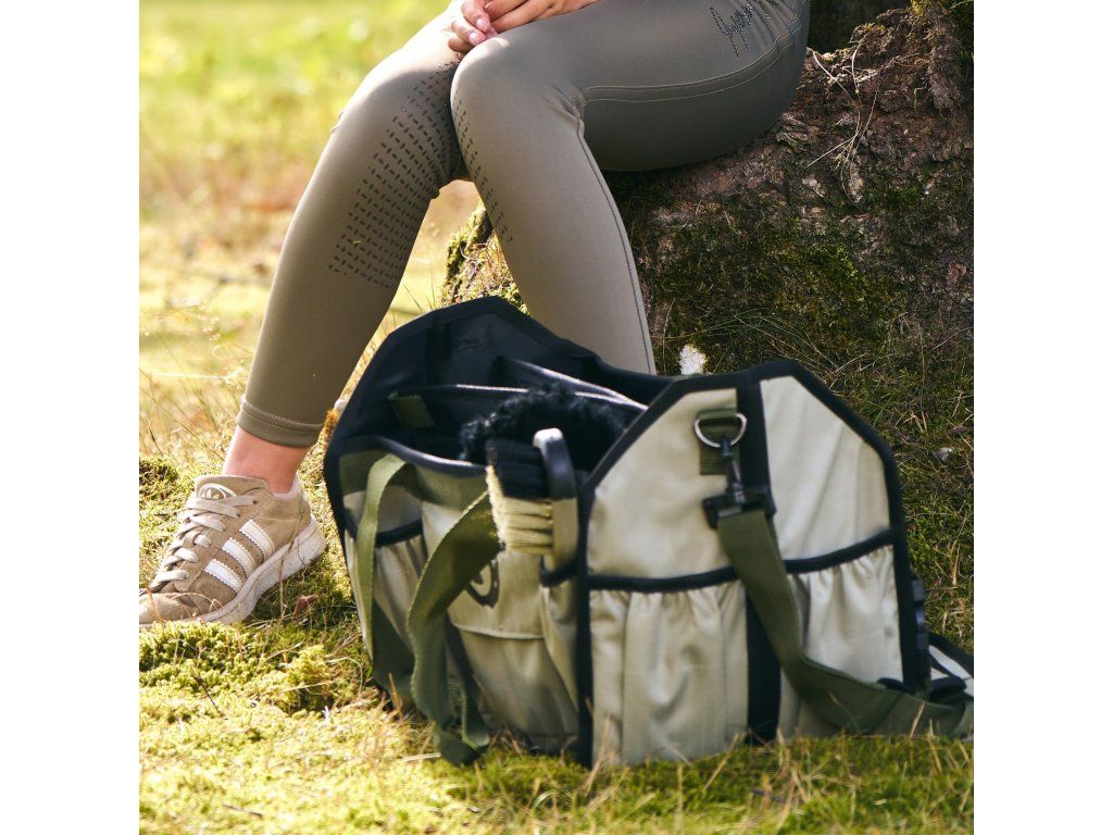Taška na čištění je praktickým a spolehlivým řešením pro bezpečné uložení veškerých kartáčů a dalších potřebných věcí. Je vyrobená z odolného polyesteru s pevností 600 D a s vodoodpudivou úpravou, která chrání čištění před vlhkostí, prachem i nečistotami ve stáji i na cestách. Zdobena třpytivým potiskem loga. Má praktický ramenní popruh, který lze odepnout a praktické vnější kapsy na různé drobnosti.