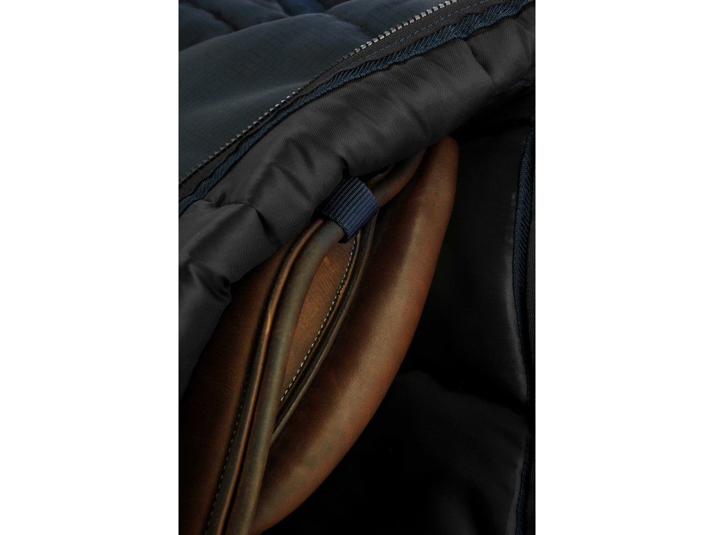 Odolná taška na sedlo, která je vyrobena z kvalitní a pevné 250 D polyesterové tkaniny v elegantní barvě navy blue. Podšívku tvoří prošívaný tmavě modrý taft 210 D s výplní z 300 g polyfilu, což zajišťuje ochranu a dostatek prostoru pro uložení sedla – díky zapínání na zip padne na sedla všech velikostí. Rozměry tašky jsou 62 x 62 cm.