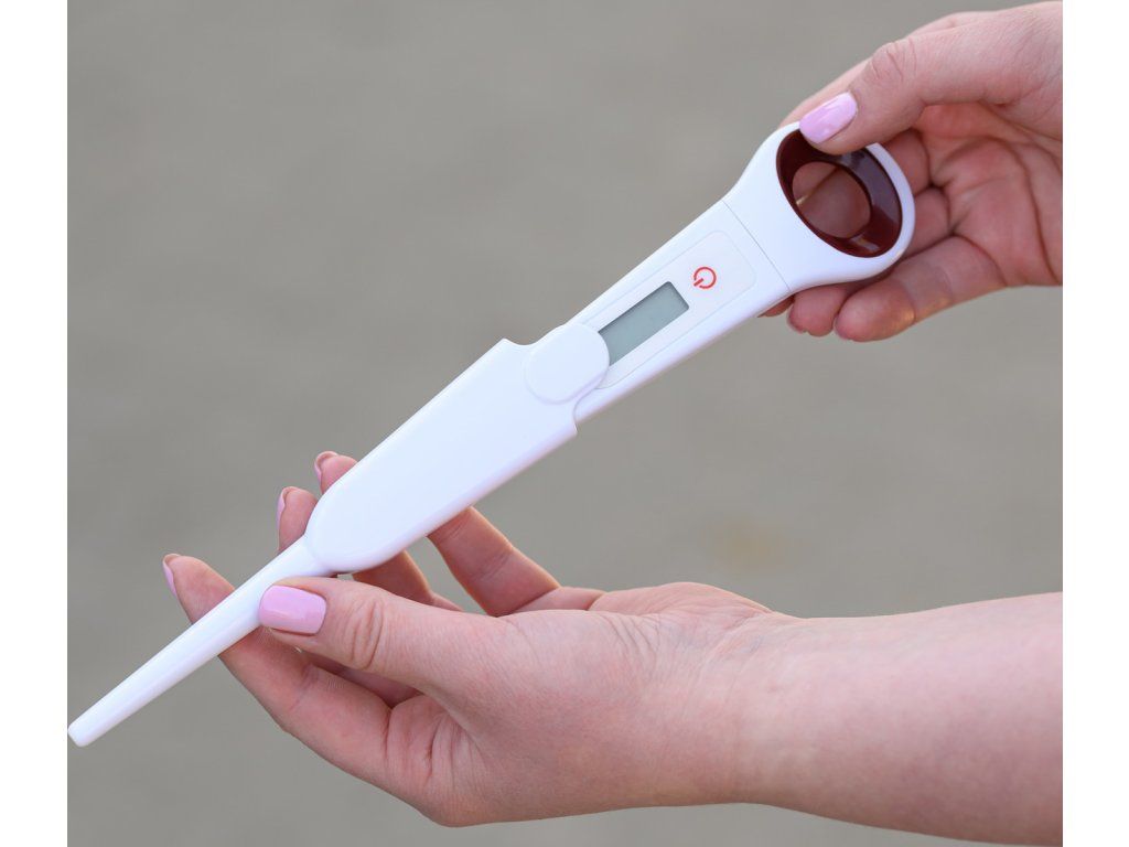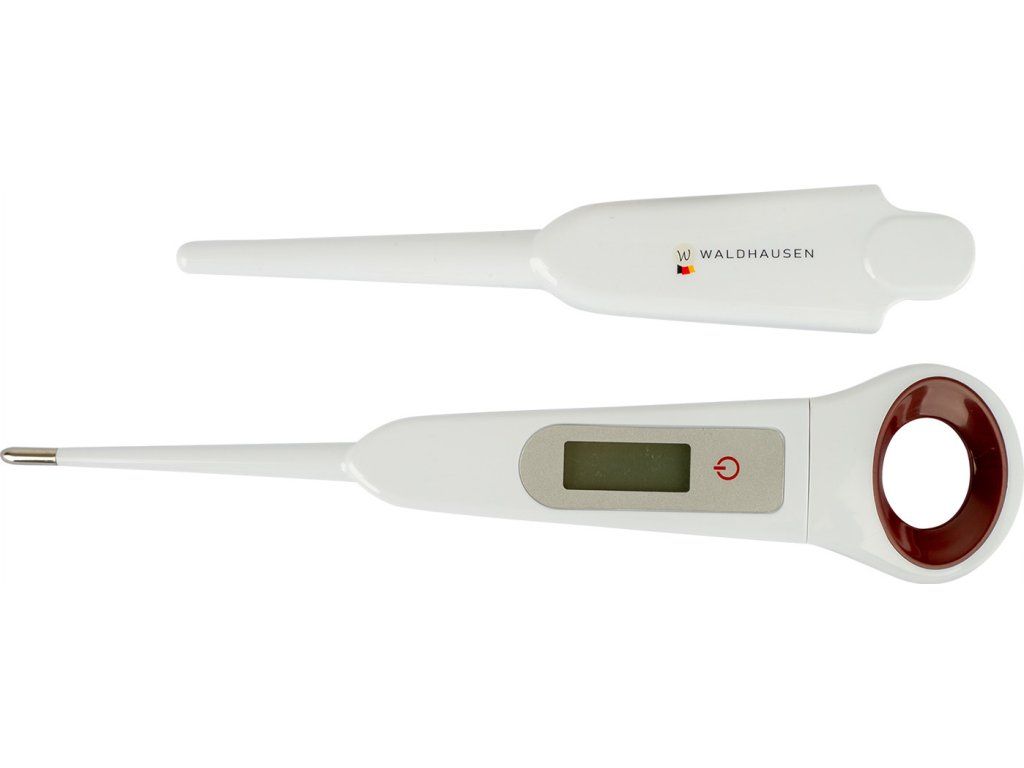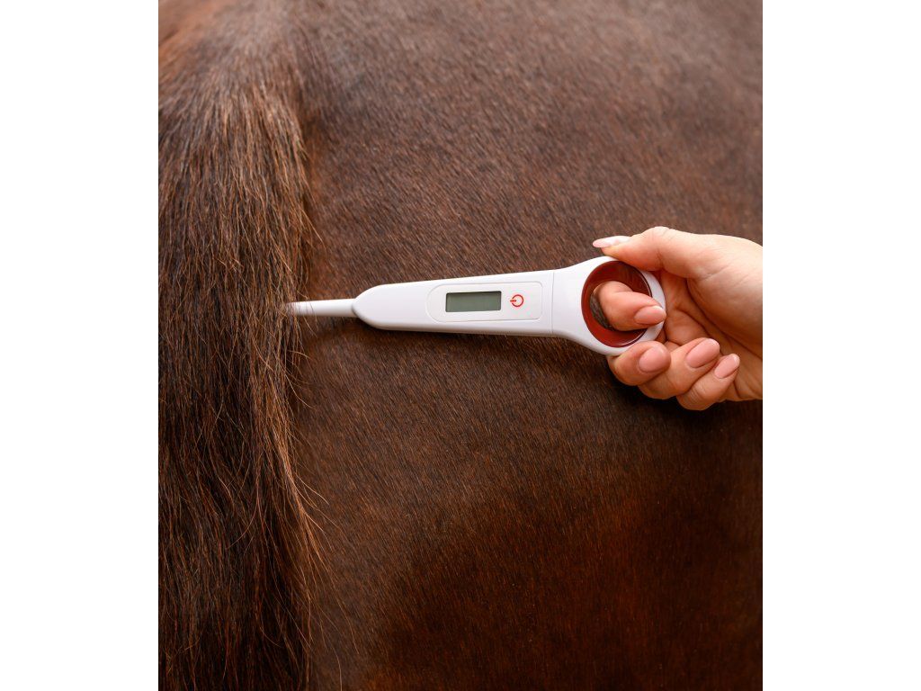 Digitální teploměr pro koně je ideální pro bezpečné, rychlé a pohodlné měření teploty ve stáji i na závodech. Tělesnou teplotu měří v rozmezí 32–43 °C během přibližně 20–25 sekund. Teploměr je vybaven praktickým otvorem na konci pro provlečení prstu, díky kterému jej lze při měření bezpečně držet. Je vyroben z odolného plastu a snadno se čistí. Použití: Teploměr zapněte podržením tlačítka. Po zobrazení všech symbolů je teploměr připraven k měření. Vložte jej rektálně a pomocí otvoru jej přidržte prstem. Po zaznění zvukového signálu (cca 20–25 sekund) se na displeji zobrazí naměřená teplota. Vypnutí: Podržením tlačítka nebo automaticky po několika minutách. Čištění: Očistěte mýdlem a vlažnou vodou, před i po každém použití dezinfikujte hrot teploměru. Neponořujte do tekutiny. Chraňte před nárazy, vysokými i nízkými teplotami.