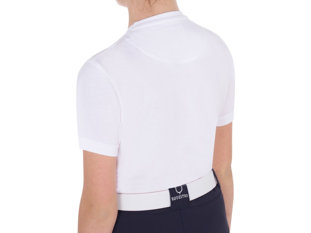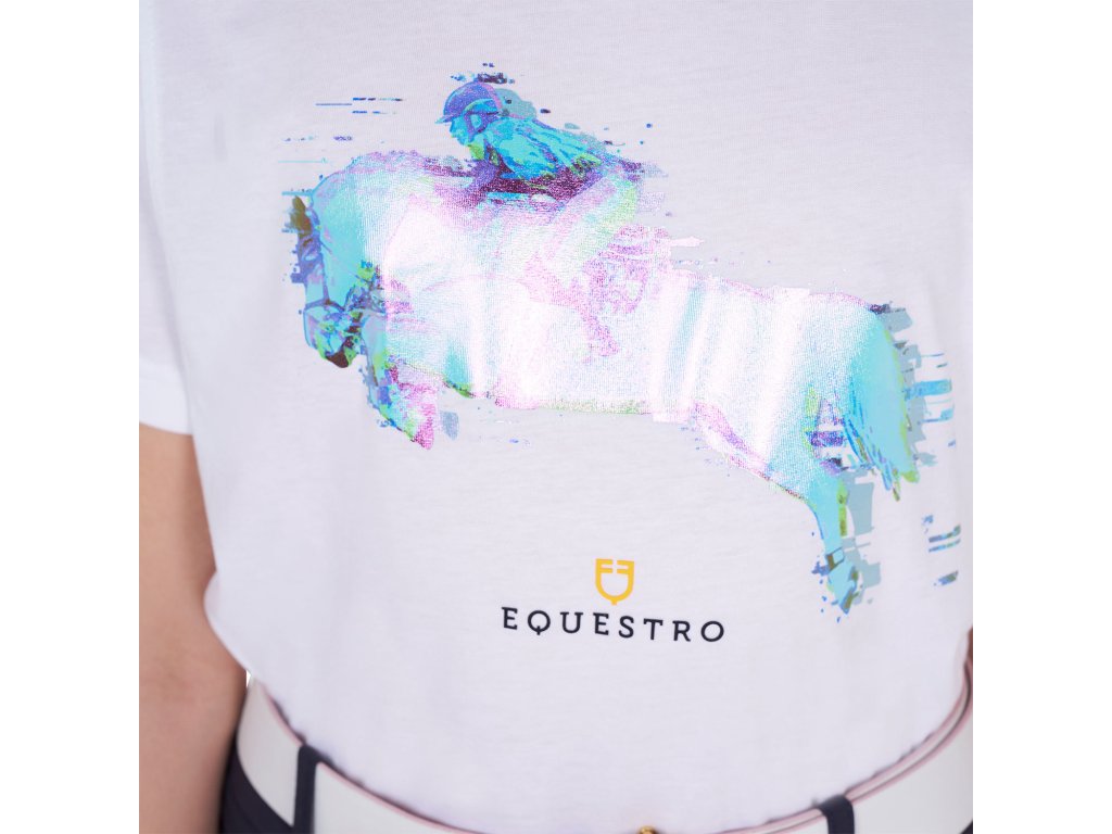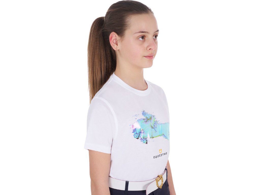 Dívčí tričko slim fit střihu vyrobeno z vysoce kvalitní měkké bavlny, která zaručuje maximální volnost pohybu a jedinečné pohodlí. Bavlna umožňuje odvádět vlhkost, což z ní činí vynikající volbu pro každého, kdo se věnuje jízdě na koni. Zdobeno pestrobarevným potiskem siluety jezdce a koně při skoku, logem a nápisem Equestro. Materiál poskytuje neuvěřitelně měkký pocit na dotek a zaručuje jedinečný komfort.