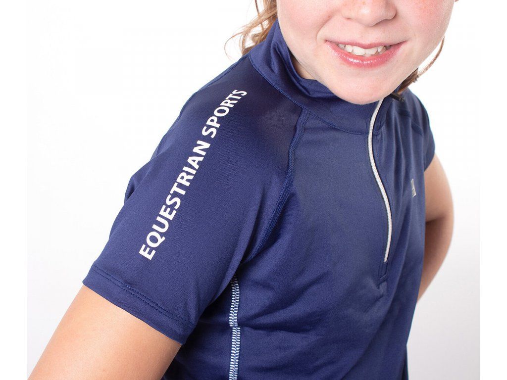 Dětské sportovní tričko s krátkým rukávem. Speciální potisk na vnitřní straně zadržuje tělesné teplo. Švy jsou opatřeny reflexní vložkou stejně jako přední zip. Zdobeno je na ramenou nápisem „Equestrian Sports“ a malým logem QHP na hrudi.