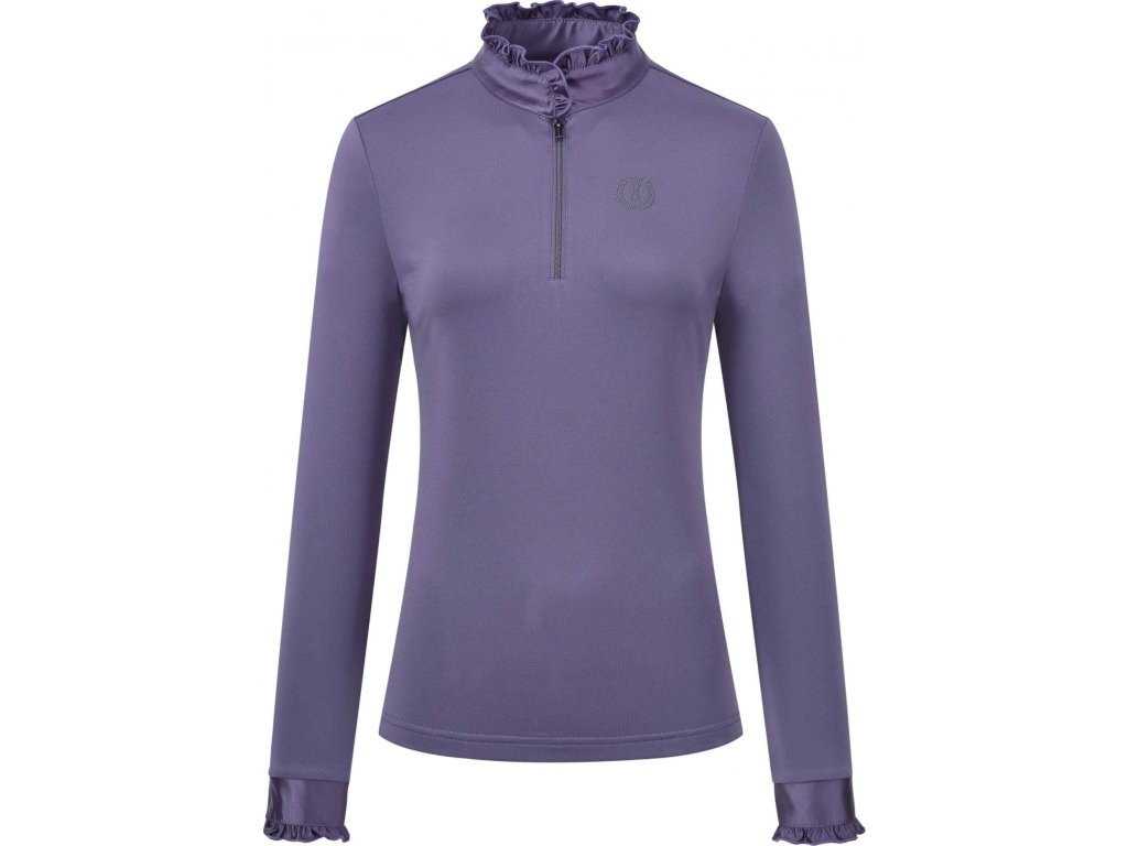 Stylové tričko s dlouhým rukávem, které spojuje eleganci, funkčnost a vysoký komfort při nošení, je ideální volbou pro trénink, práci ve stáji i běžné nošení. Tričko je vyrobeno z jemného žerzejového materiálu s vnitřní česanou úpravou, která zajišťuje příjemný tepelný komfort a pohodlí po celý den. Stojáček, poloviční zip a jemné volánky na límečku i rukávech dodávají tričku elegantní vzhled. Rychleschnoucí materiál pomáhá udržet pocit svěžesti i při intenzivní aktivitě a logo Imperial Riding zdobené kamínky na hrudi podtrhuje elegantní a výrazný charakter trička.