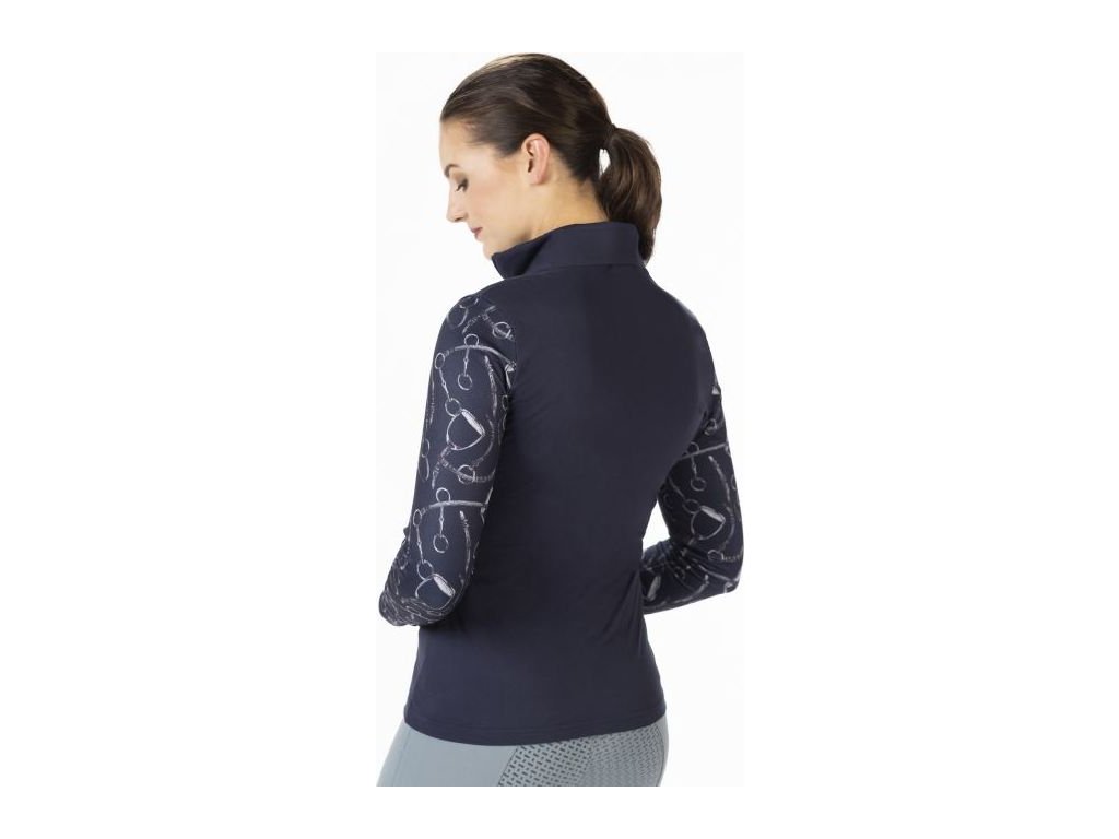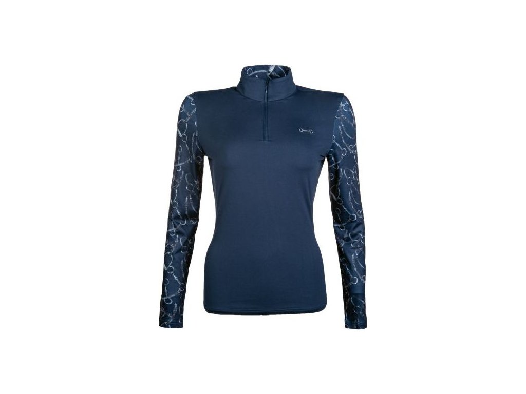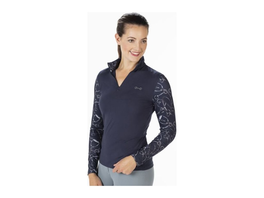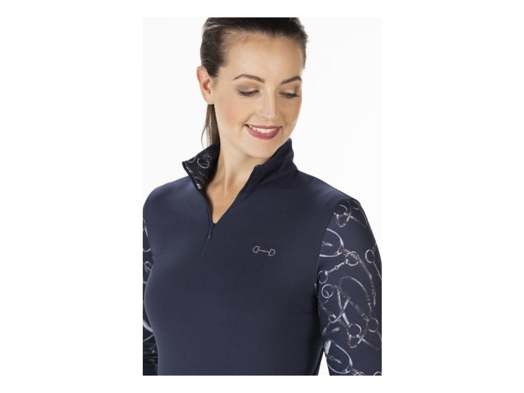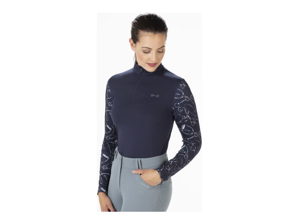Stylové funkční triko s dlouhým rukávem. Vybaveno polovičním zipem a vyšším límce. Zdobeno decentními kamínky ve tvaru udidla na hrudi. Rukávy mají celoplošný potisk jezdecké tématiky. Vhodné do stáje, ale také na veškeré sportovní aktivity. Triko je velmi pohodlné díky měkké a elastické tkanině. Perfektní spodní vrstva vašeho outfitu nebo jako vrchní vrstva do přechodných období jara a podzimu. Lze prát v pračce do 30°C a sušit v sušičce pomocí studeného vzduchu.