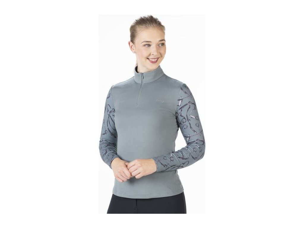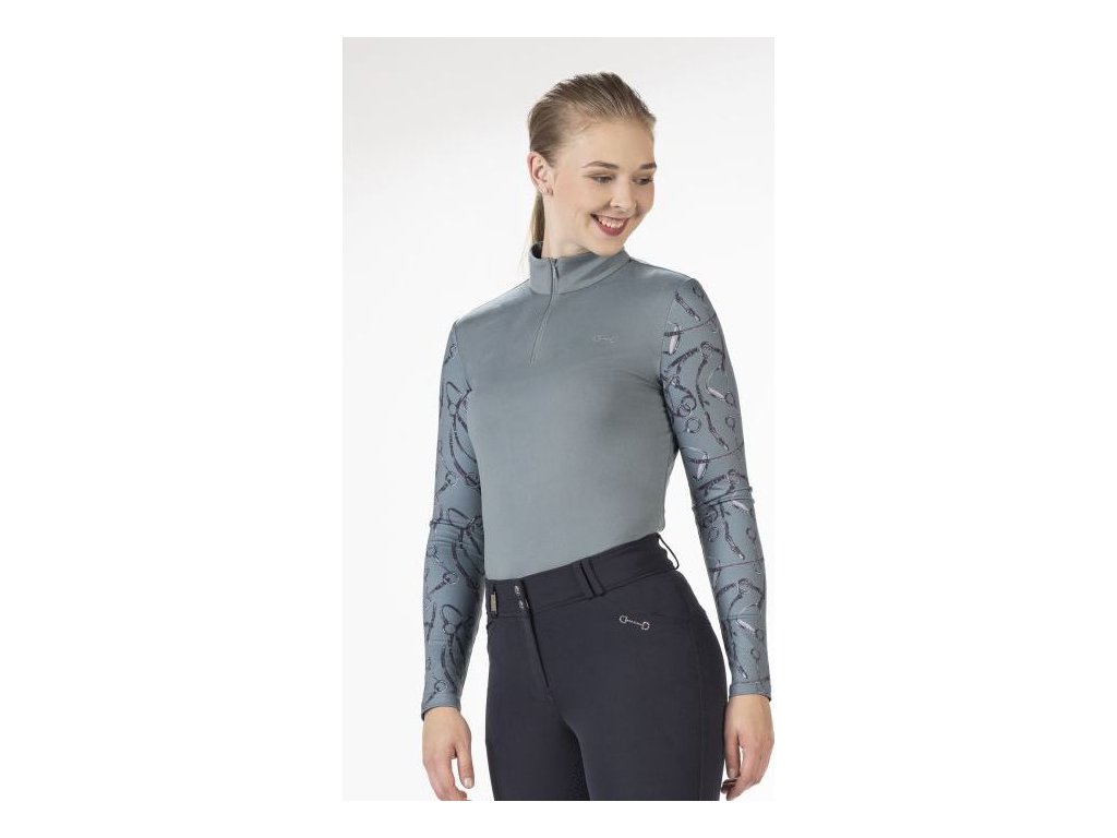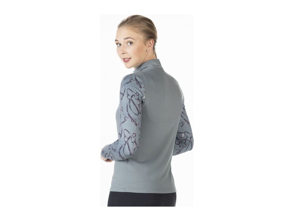 Stylové funkční triko s dlouhým rukávem. Vybaveno polovičním zipem a vyšším límce. Zdobeno decentními kamínky ve tvaru udidla na hrudi. Rukávy mají celoplošný potisk jezdecké tématiky. Vhodné do stáje, ale také na veškeré sportovní aktivity. Triko je velmi pohodlné díky měkké a elastické tkanině. Perfektní spodní vrstva vašeho outfitu nebo jako vrchní vrstva do přechodných období jara a podzimu. Lze prát v pračce do 30°C a sušit v sušičce pomocí studeného vzduchu.