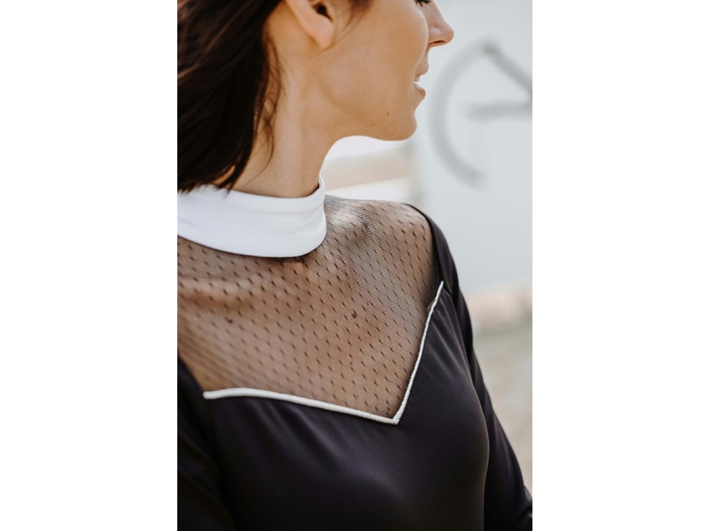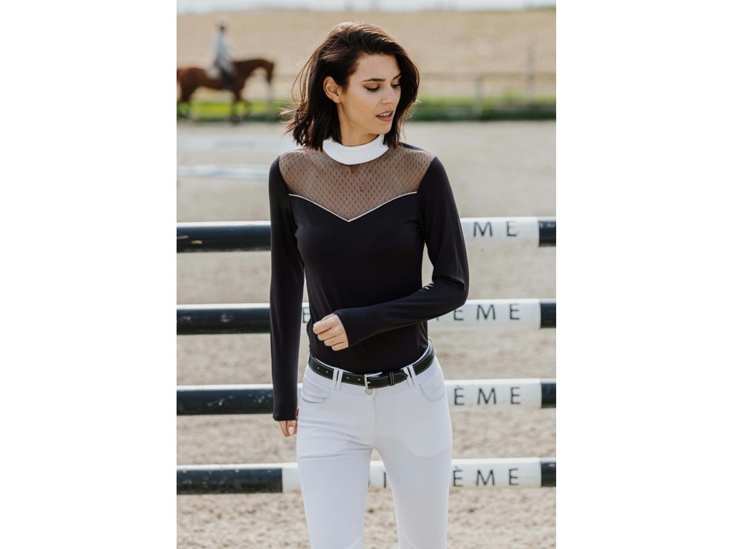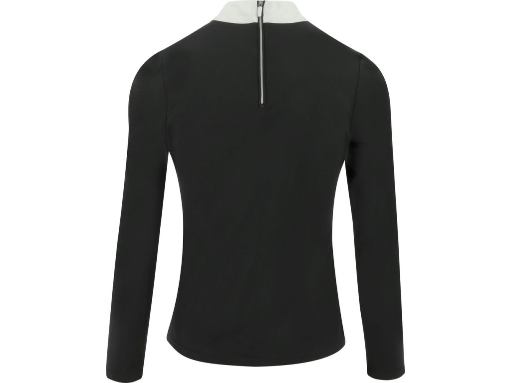Kvalitní triko s dlouhým rukávem a srdcovým střihem kombinuje elegantní design s funkčními vlastnostmi. Lehké a měkké tkanina poskytuje maximální pohodlí, zatímco prodyšný materiál udržuje příjemnou teplotu během celého nošení. Triko má přiléhavý střih, zadní zapínání na zip a bílý vysoký límec. Dlouhé rukávy a kontrastní lemování na přední straně dodávají modelu moderní vzhled a sportovní charakter.