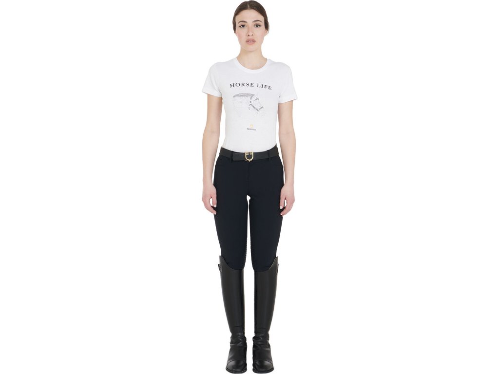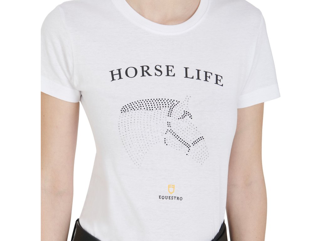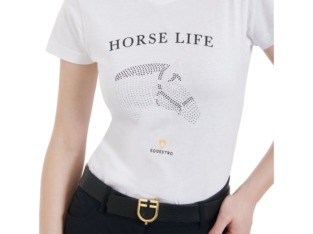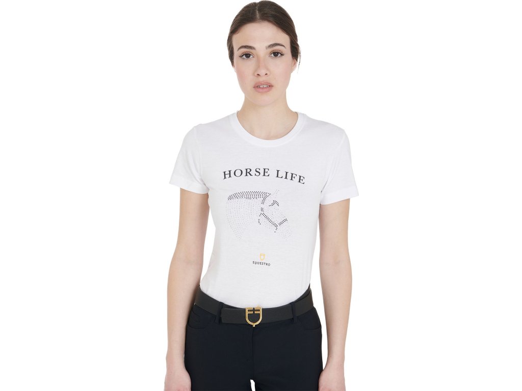 Dámské tričko s krátkým rukávem, vyrobené z měkké bavlny, která chrání před vysokými teplotami, podporuje odpařování a rozptyl potu. Vynikající střih a pohodlí. Zdobeno třpytivým potiskem koně a nápisem Horse Life. K dispozici také v černé barvě. Vyrábí se ve velikostech XS - XL.