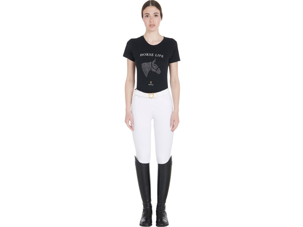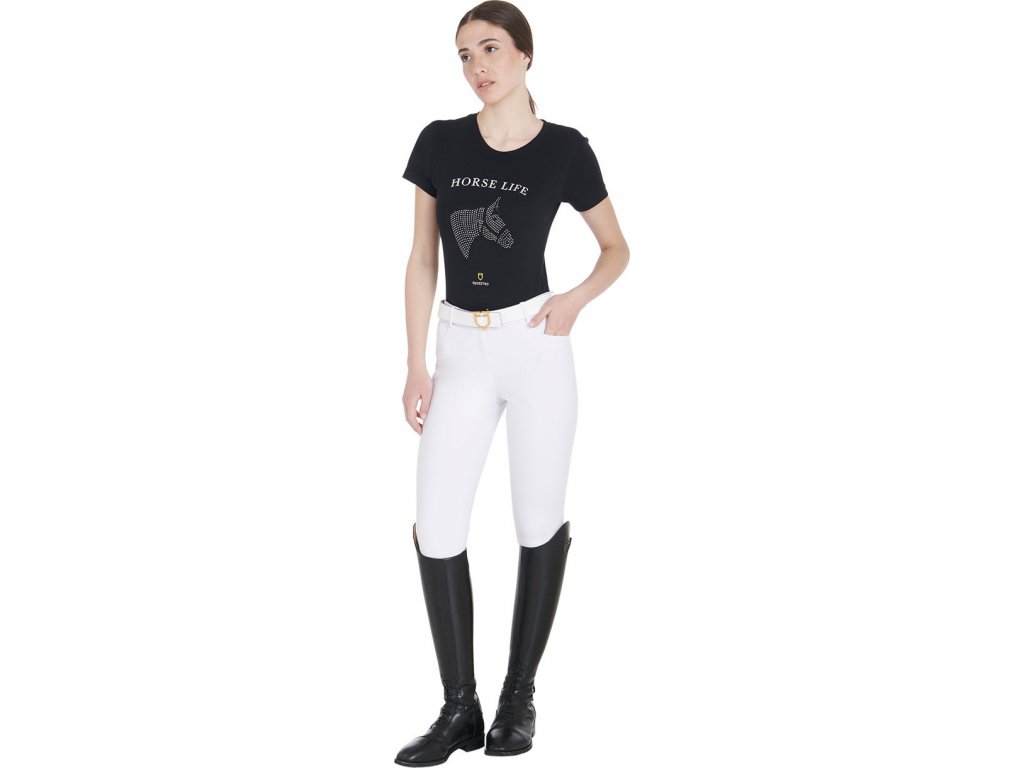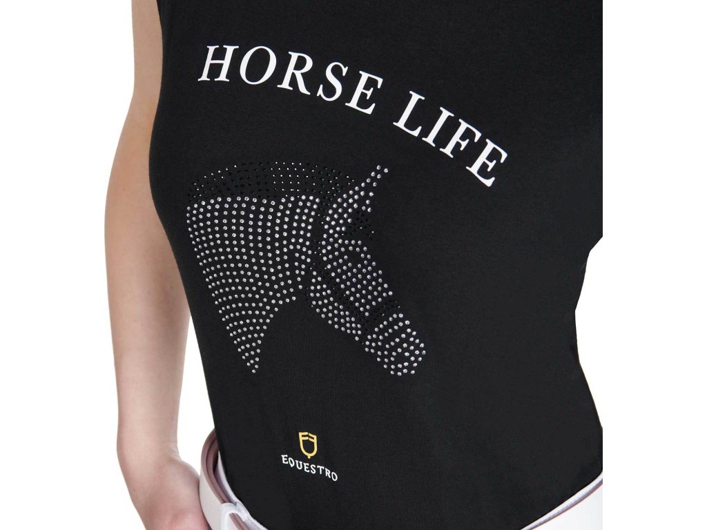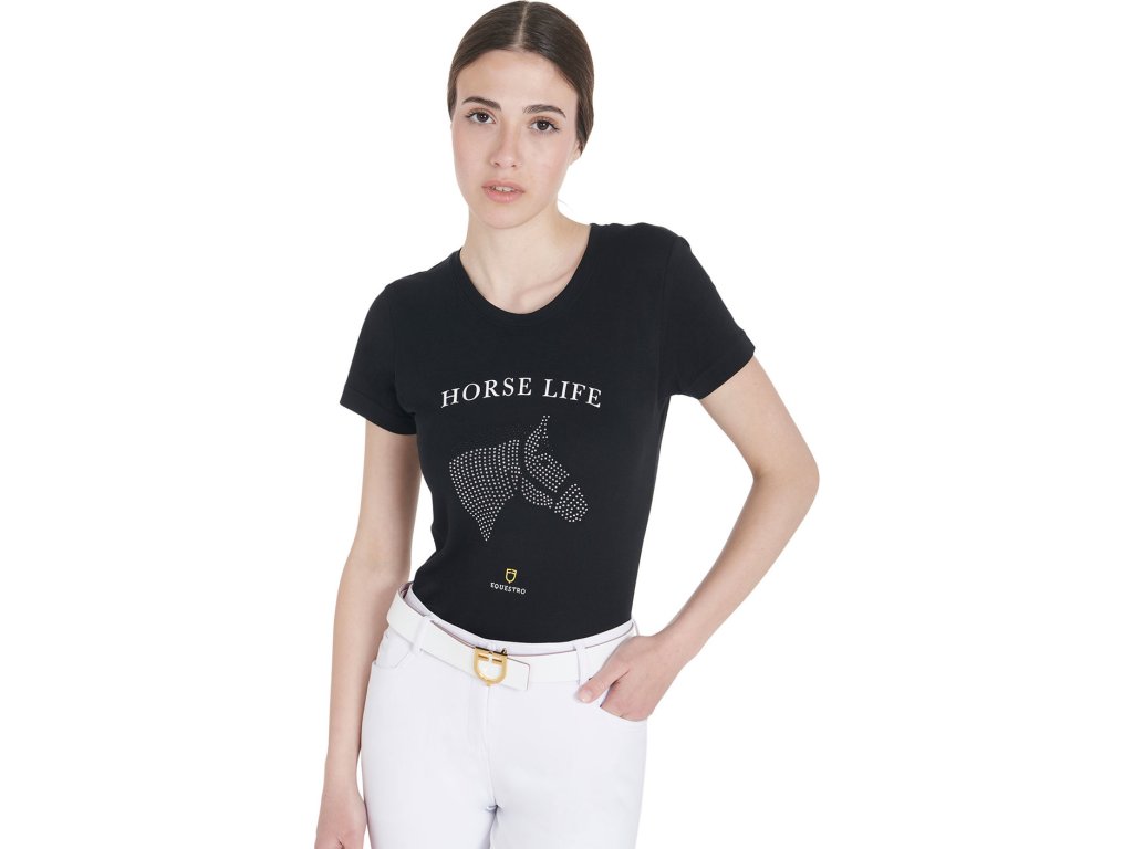 Dámské tričko s krátkým rukávem, vyrobené z měkké bavlny, která chrání před vysokými teplotami, podporuje odpařování a rozptyl potu. Vynikající střih a pohodlí. Zdobeno třpytivým potiskem koně a nápisem Horse Life. K dispozici také v bílé barvě. Vyrábí se ve velikostech XS - XL.