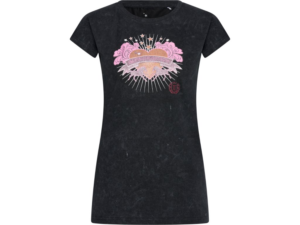 Kvalitní bavlněné žerzejové tričko v moderním vzoru dirty dye (barvení s nerovnoměrnými odstíny pro jedinečný, originální vzhled). Tričko má kulatý výstřih a krátké rukávy. Výrazným detailem je třpytivý potisk na hrudi.
