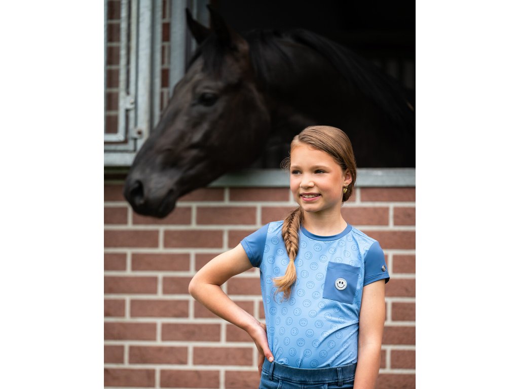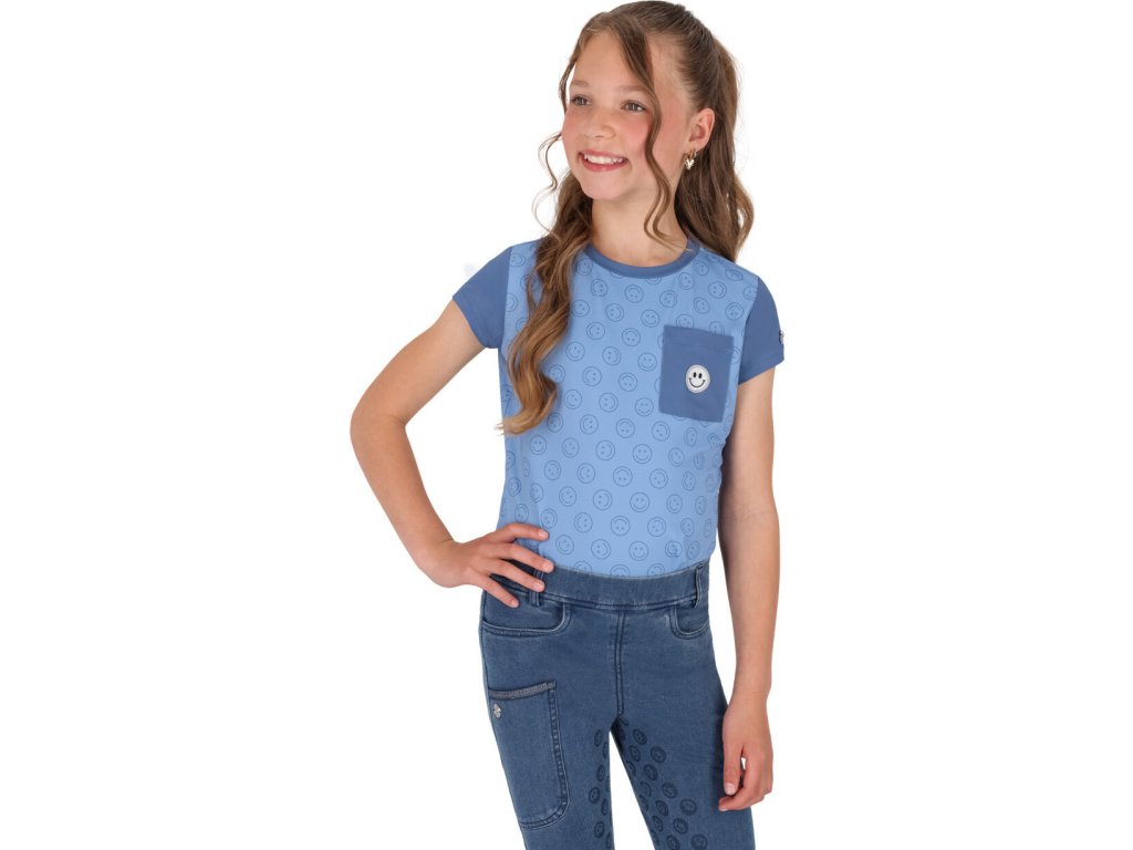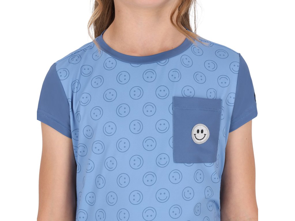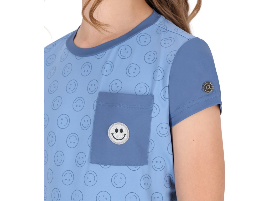 Dětské tričko s krátkým rukávem a veselým potiskem smajlíků po celém těle. Tričko je vyrobené z měkkého a příjemného materiálu, který zajišťuje pohodlí při pohybu i hraní. Náprsní kapsa je zvýrazněná tmavší modrou barvou a zdobí ji usměvavý smajlík, který tričku dodává hravý a veselý detail. Ideální volba pro každodenní nošení. Lze prát v pračce na 30 °C, doporučujeme nepoužívat aviváž a nesušit v sušičce.