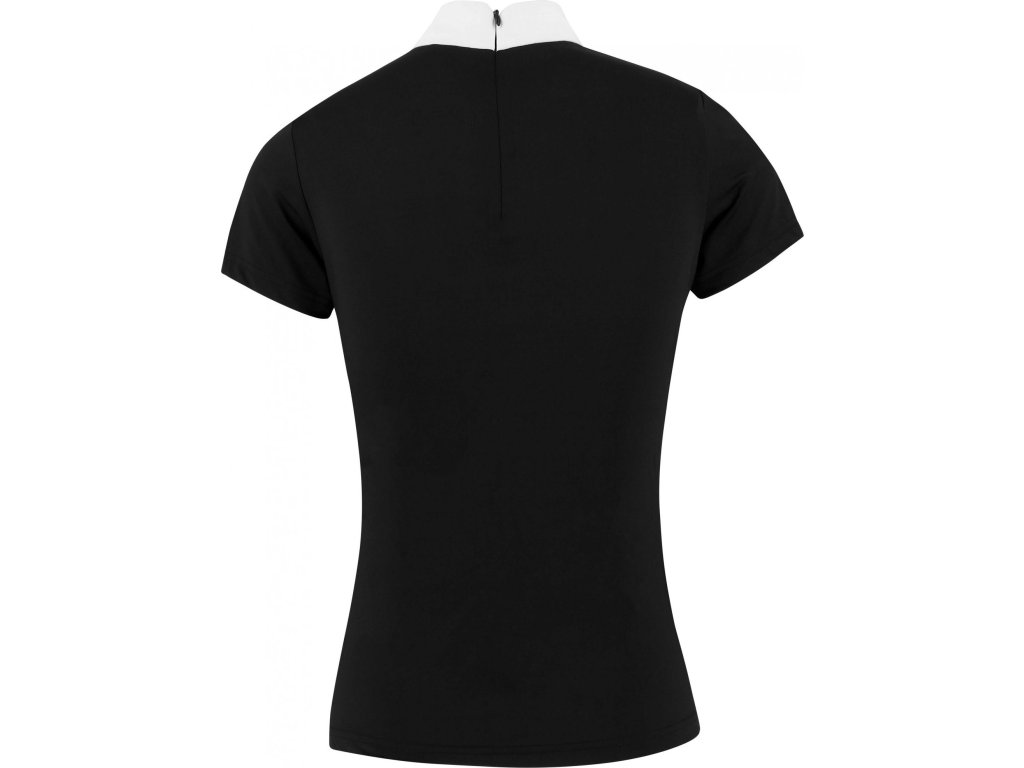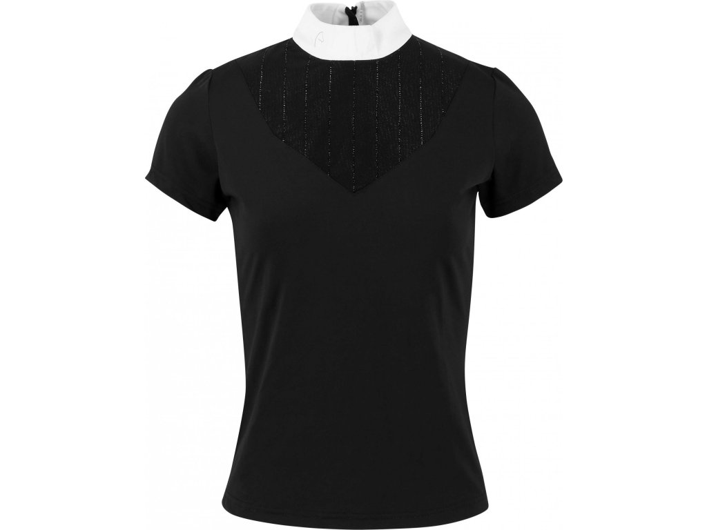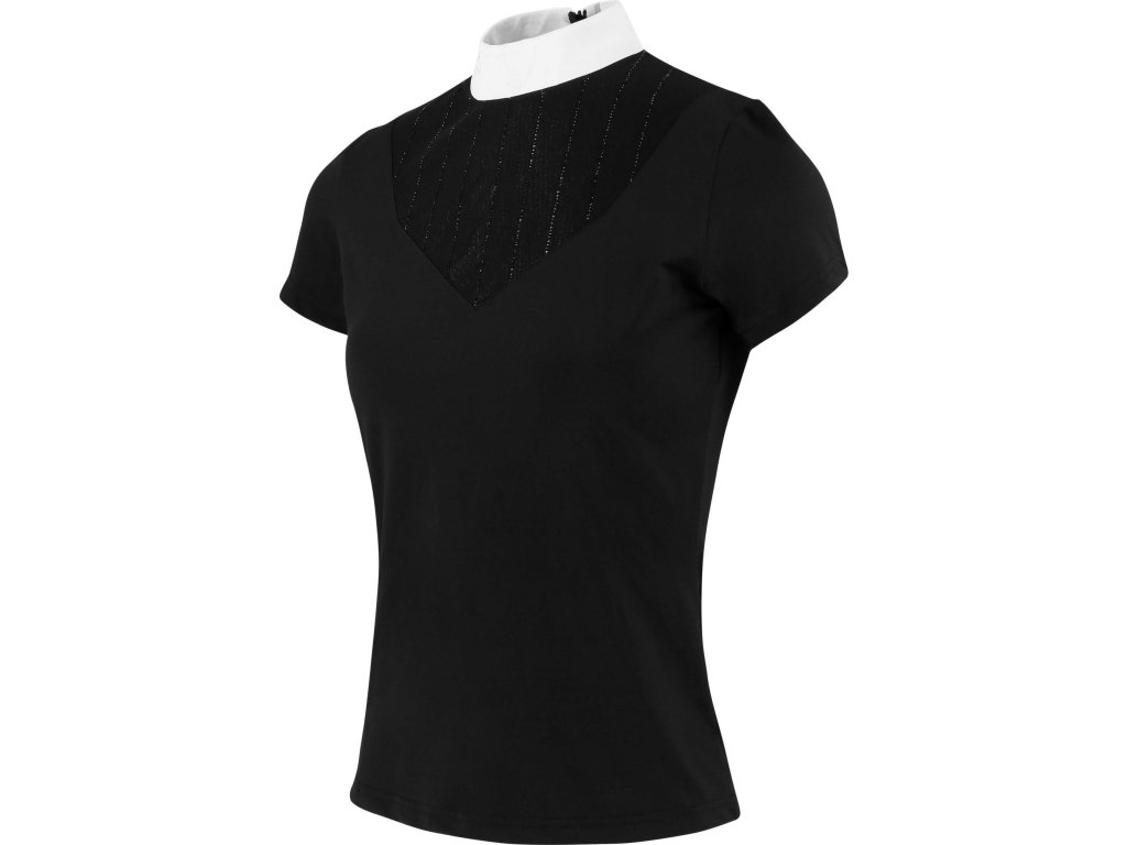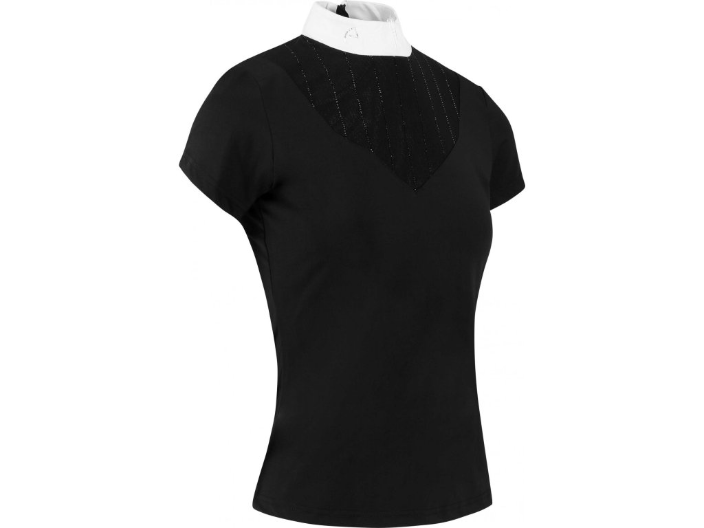 Moderní závodní triko, které spojuje sportovní funkčnost s elegantním vzhledem. Lehký, prodyšný a rychleschnoucí materiál se čtyřsměrnou pružností zajišťuje volnost pohybu a maximální pohodlí při jakékoliv aktivitě. Elegantní výstřih do V je zdobený jemnými kamínky a flitry, zadní zapínání na zip usnadňuje oblékání.