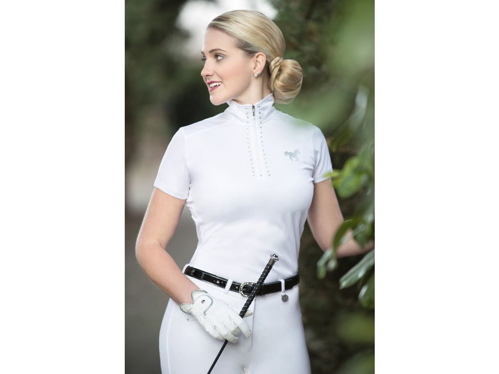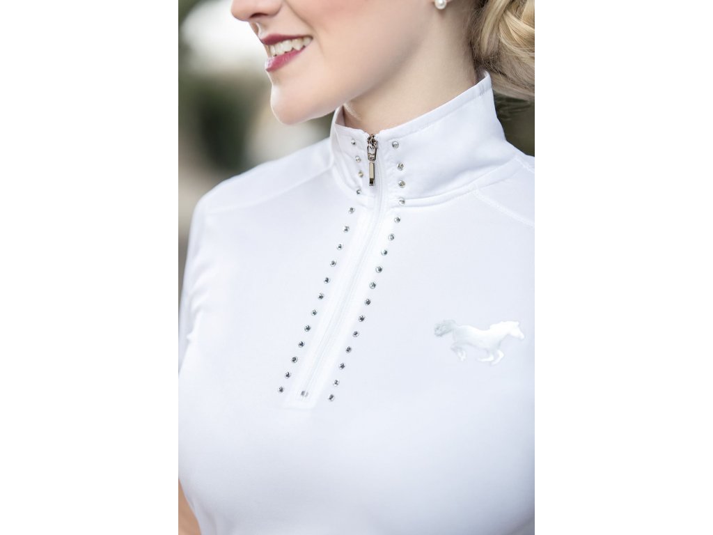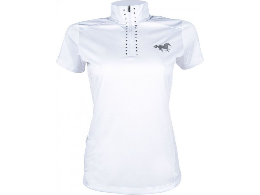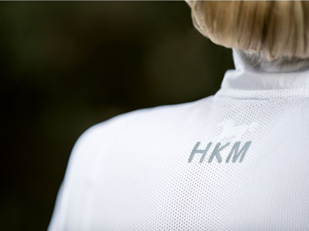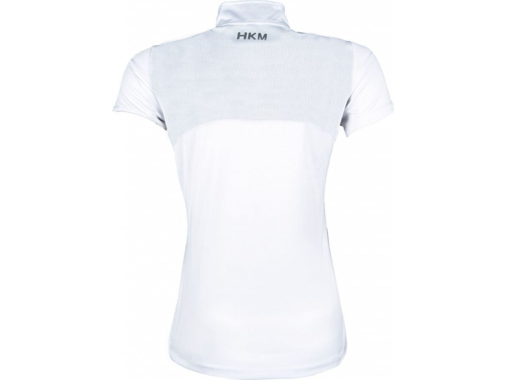 Funkční závodní triko se síťovanou vložkou v oblasti zad od značky HKM. Vyrobené z elastického a velmi prodyšného materiálu. Vybaveno límcem se zapínáním na zip a zdobeným třpytivými kamínky. Dále má tričko logo HKM v zadní části a stříbrný potisk koně na levé straně hrudi.