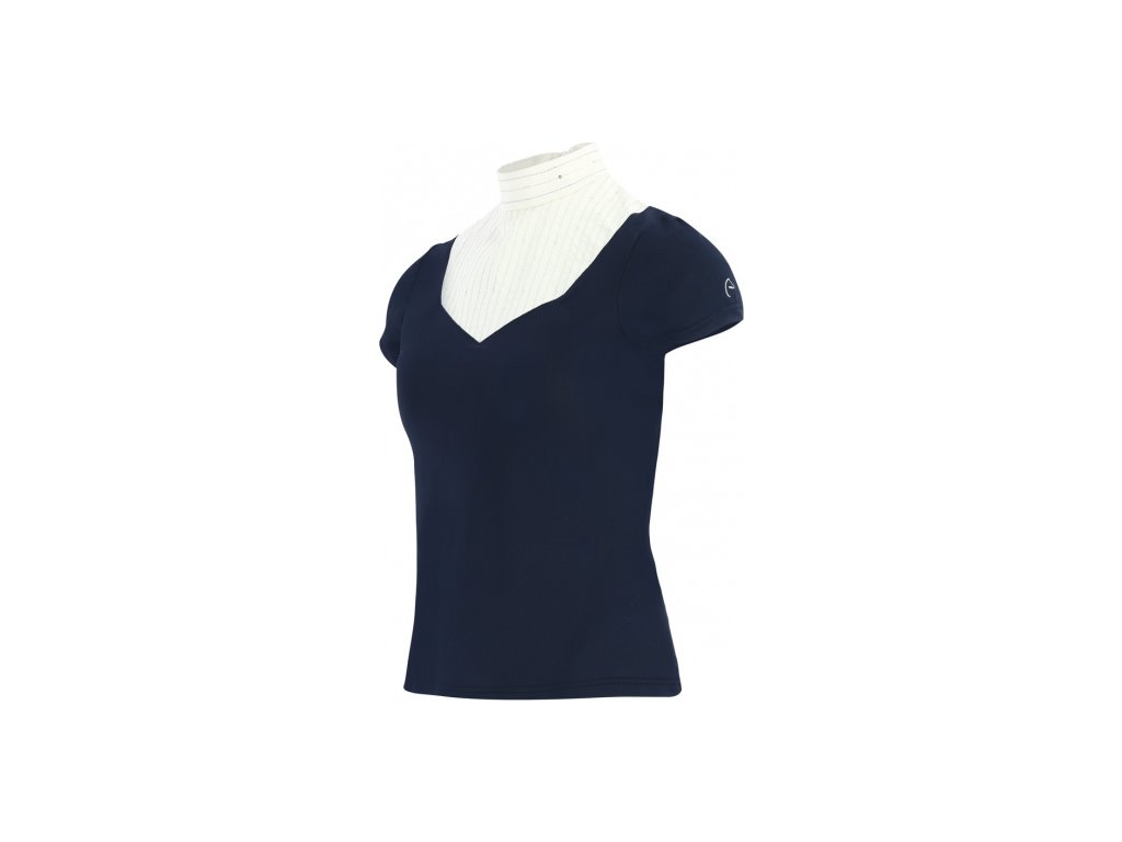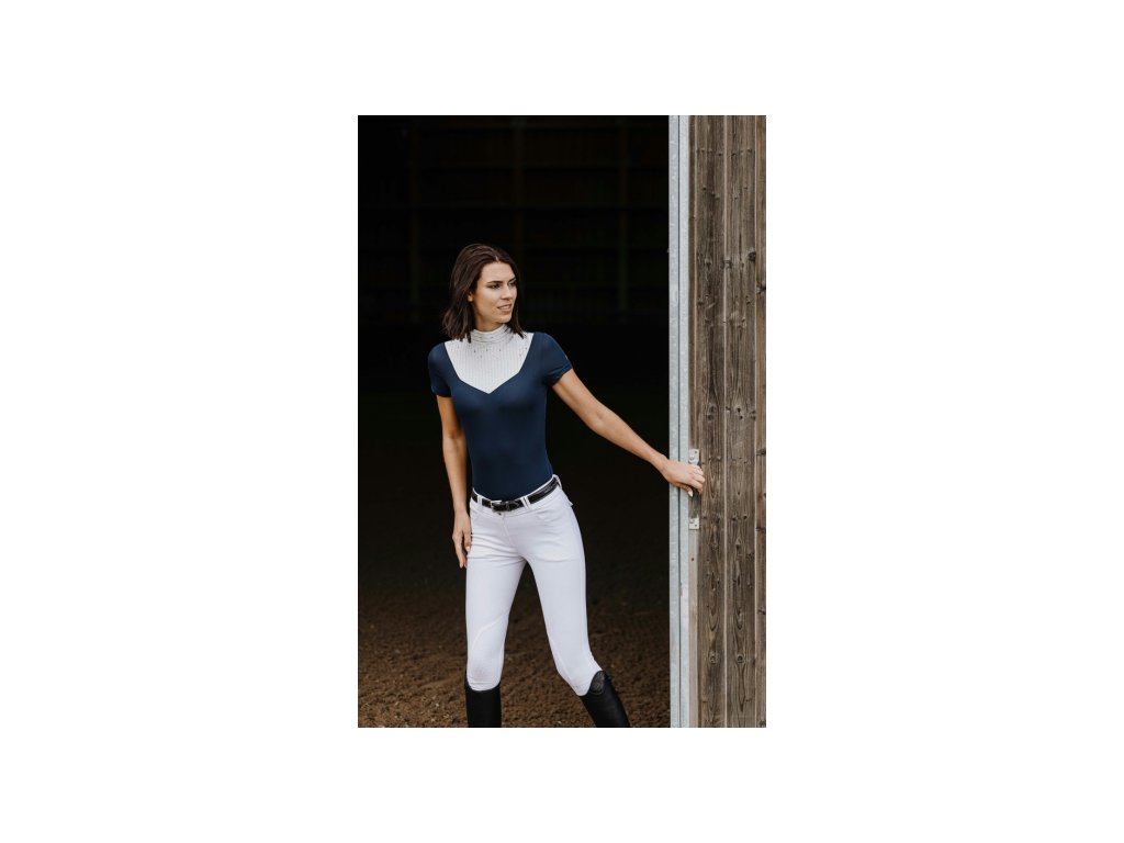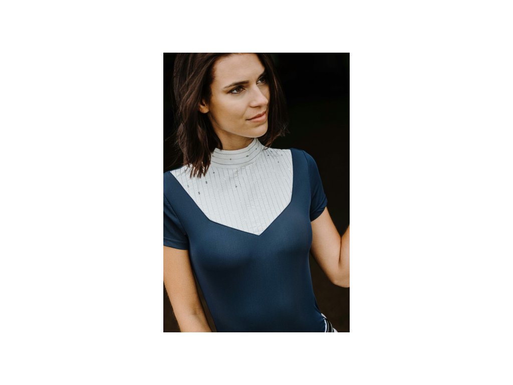 Závodní triko s krátkým rukávem, které spojuje pohodlí a elegantní detaily. Přizpůsobený střih perfektně sedí na těle, zatímco praktické zapínání na zip na zádech usnadňuje oblékání a pohodlné nošení. Bílý stojatý límec dodává triku uhlazený vzhled a popelínová část na přední straně zdobená flitry přináší jemný lesk a sofistikovaný detail.