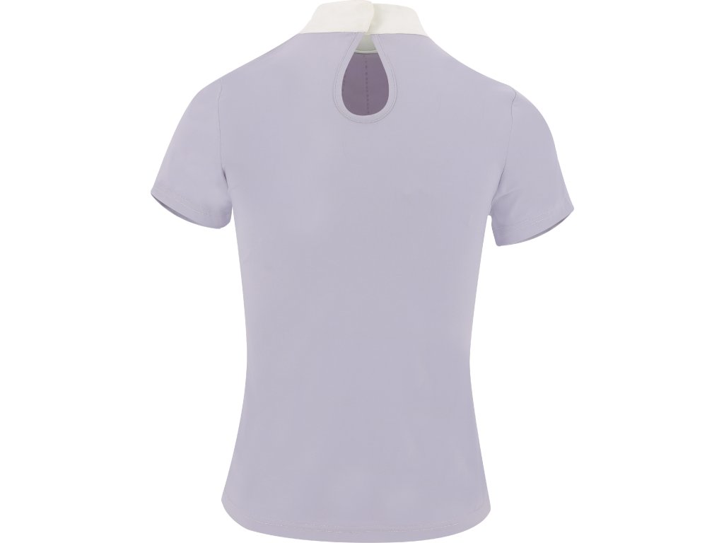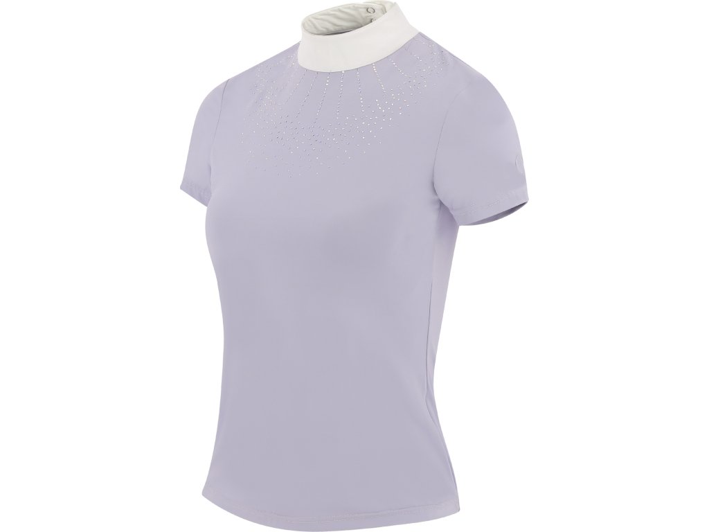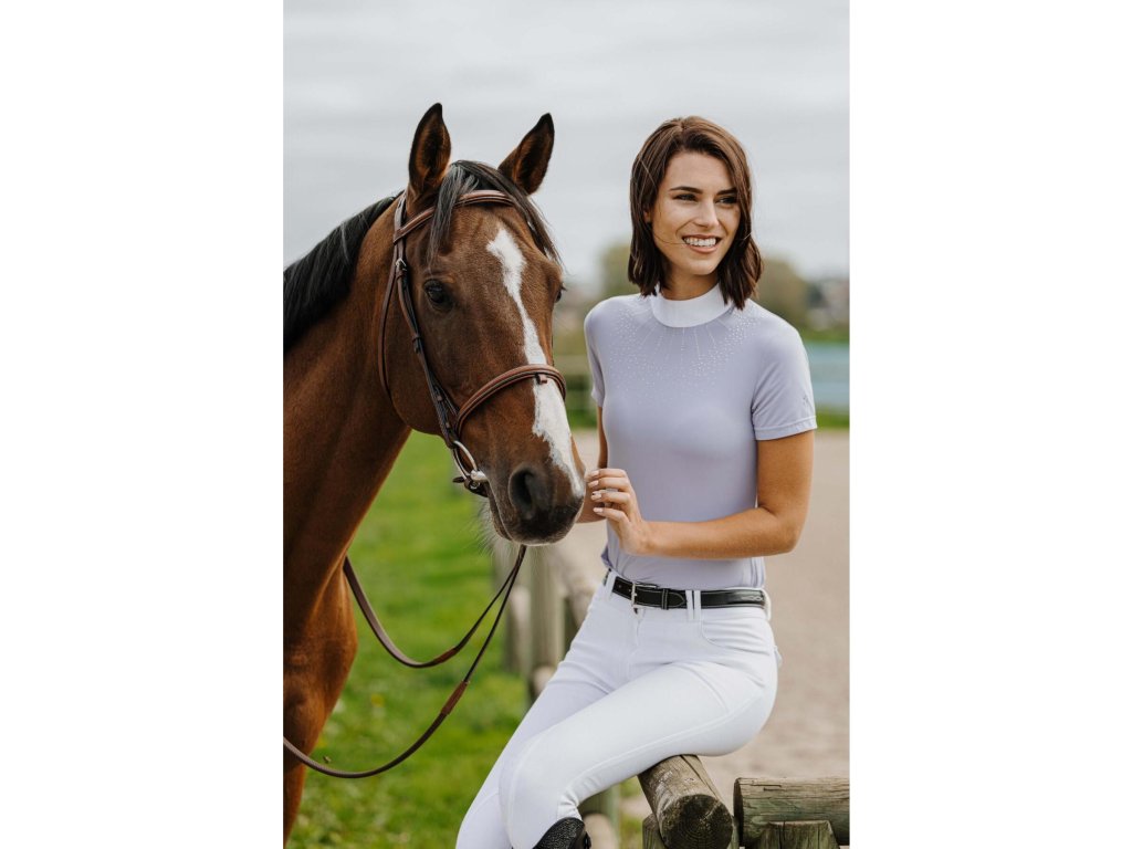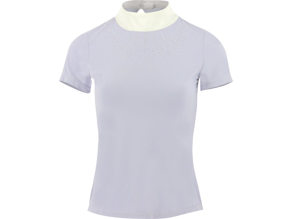 Lehké a funkční závodní tričko s krátkým rukávem kombinuje eleganci s maximálním pohodlím. Prodyšná a pružná tkanina se přizpůsobí postavě a díky vypasovanému střihu zajistí dokonalý vzhled i volnost pohybu. Zapínání na knoflíky na zádech doplňuje klasický bílý stojáček. Na hrudi je zdobeno kamínky.