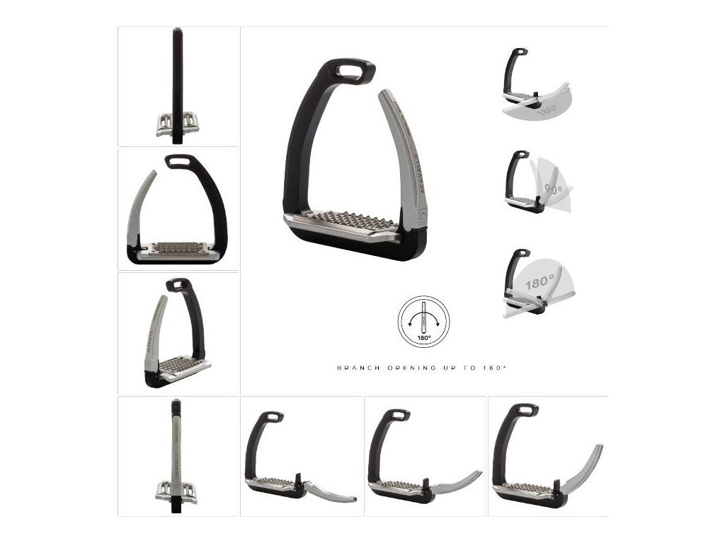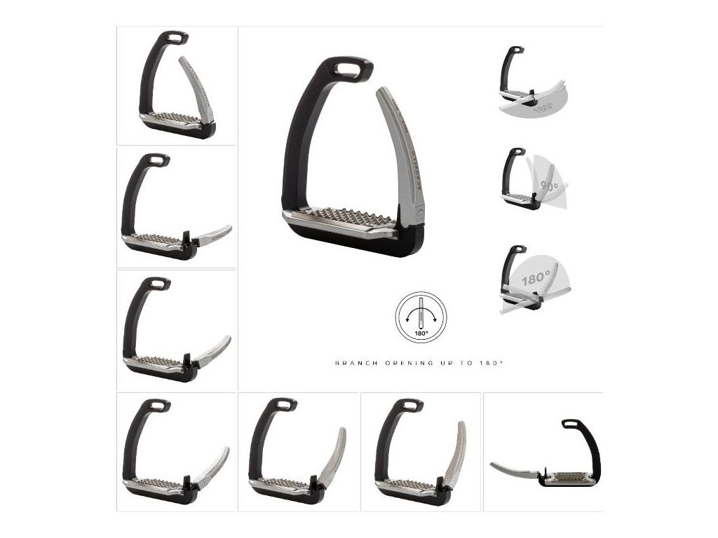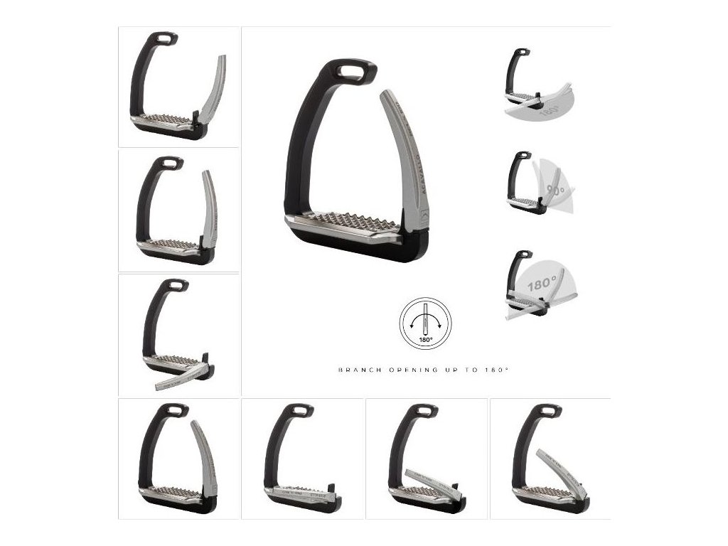 Bezpečnostní třmeny Acavallo Rel-X EASY 180° nabízí jezdci maximální komfort. Třmeny mají patentovaný boční uvolňovací mechanismus a pokročilé technické složení. Tento model Rel-X EASY 180° je navíc vybaven inovativním systémem. Otočné rameno se dokáže otevřít až o 180°, což umožňuje velmi snadné uvolnění nohy jezdce v případě pádu. Jsou vyrobeny z velmi kvalitního kovu a pružných polymerů - ve srovnání s tradičními třmeny nabízí řada Rel-X-EASY větší pohodlí a odpružení při jízdě. Extra široká nášlapná plocha, která je skloněná pod úhlem 5° tlumí nárazy jezdcovy váhy - např. v lehkém sedu/ během skákání, a zajistí maximální jezdecký komfort. Výhody pro jezdce spočívají v silné úlevě nohou, kotníků, kolen a boků. Nerezová ocel chrání nášlapnou plochu proti korozi a zaručuje tak dlouhou životnost produktu. Třmen je vybaven patkou se systémem Grip a je pokryt hliníkem s povrchovou úpravou „shot peening. Třmeny jsou navíc velmi lehké, přesto extrémně odolné. Hmotnost jednoho třmenu 519 g. Dodávané v páru a v jedné univerzální velikosti s šířkou nášlapné plochy 12,5 cm.
