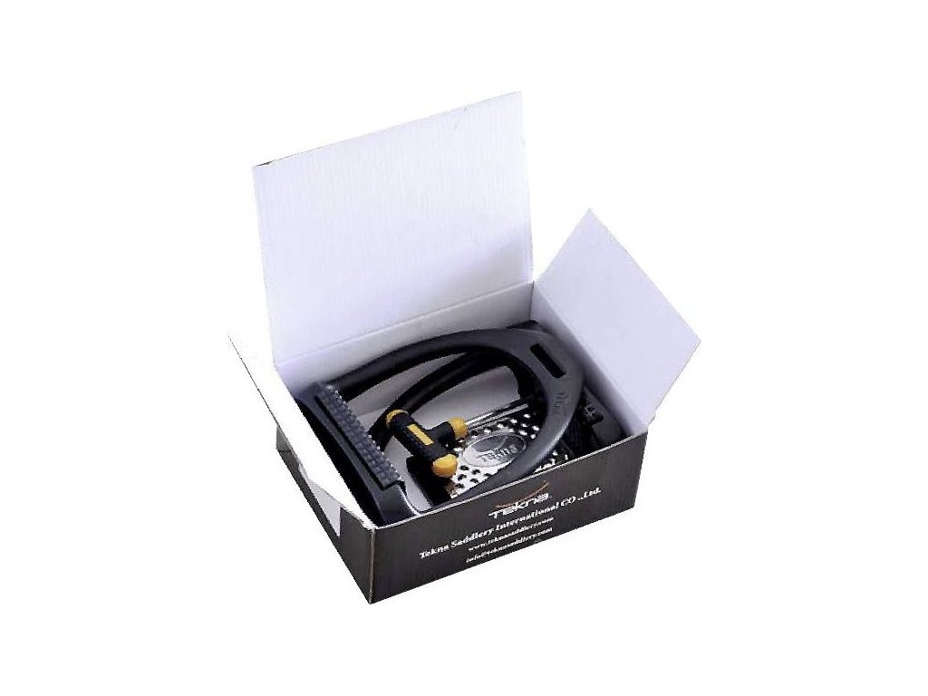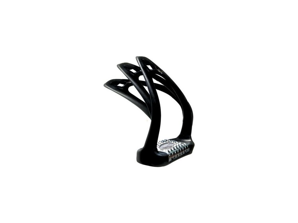 Kloubové plastové třmeny v černé barvě, šířka 12 cm. Ve spodní části jsou třmeny pohyblivé pro maximální pohodlí a bezpečí jezdce. Třmeny jsou dodávány s plastovými a kovovými podložkami, které lze lehce vyměnit. Nástroj k výměně podložek je též součástí balení. Váha jednoho třmenu je 276 g. Dodávané v páru.