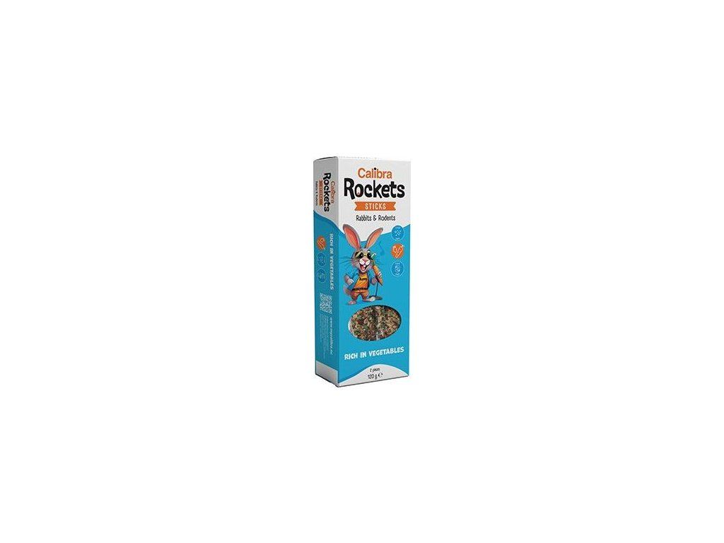 Pochoutka určena pro králíky, morčata, činčily, osmáky a další hlodavce. Dvě tyčinky s obsahem zeleniny jsou plné dalších jejich oblíbených ingrediencí. Tyčinky jsou vyráběné ručně a jsou balené v ochranné atmosféře pro maximální zachování čerstvosti. Tyčinky mají závěsný systém, který umožňuje zavěšení na okraj terária nebo mřížku u klece. Malí kamarádi našich dětí budou Calibra Rockets tyčinky milovat. A dětem určitě udělá radost veselý obal s kreslenými Calibra Rockets postavičkami.