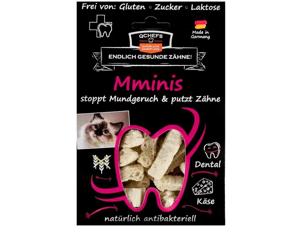Tyčinky na čištění zubů pro kočky Mminis od QCHEFS je prémiový pamlsek nejen pro péči o zuby vaší kočky. Je určen pro opravdové kočičí požitkáře, kteří rádi žvýkají. Nejdřív křupavé a pak na žvýkání - to je čistá radost! Žvýkání stimuluje tvorbu slin a chrání sliznice. Sliny rovnoměrně rozprostírají obsažené peptidy v tlamě. Jako každodenní pamlsek pro péči o zuby a oblíbený rituál před spaním jsou tyto pamlsky vysoce stravitelné a vhodné i pro kočky s citlivým žaludkem. Přirozeně antibakteriální peptidy redukují bakterie a udržují vyváženou ústní flóru. Zápach z úst je redukován a zuby udržovány čisté. Bez laktózy, bez přidaného cukru. S nízkým obsahem tuku a kalorií. Pro kontrolu zubního kamene jsou vhodnější Vločky na čištění zubů od QCHEFS.