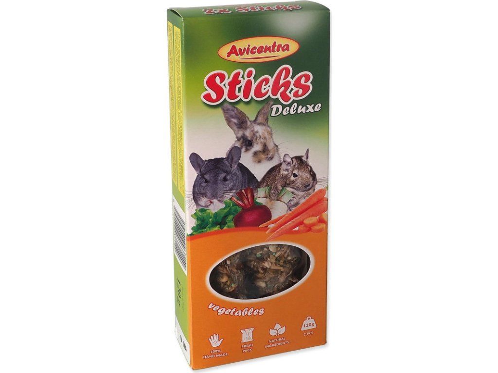 Doplňkové krmivo pro králíky, morčata a další hlodavce. Tyčinky se zeleninou jsou výbornou pochoutkou, ale také krmivem, které Vašemu mazlíčkovi dodává důležité vitamíny a minerály pro zdravý a vitální život. Tyčinky jsou speciální krmivo, kde musí Váš mazlíček vyvinout úsilí k získání své potravy podobně jako v přirozeném prostředí. To napomáhá jeho fyzické a psychické kondici.