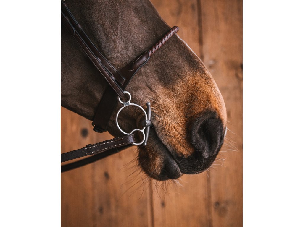 - Otěže zapnuté do středového kroužku = bude fungovat jako kombinace Baucherova udidla a volných kroužků