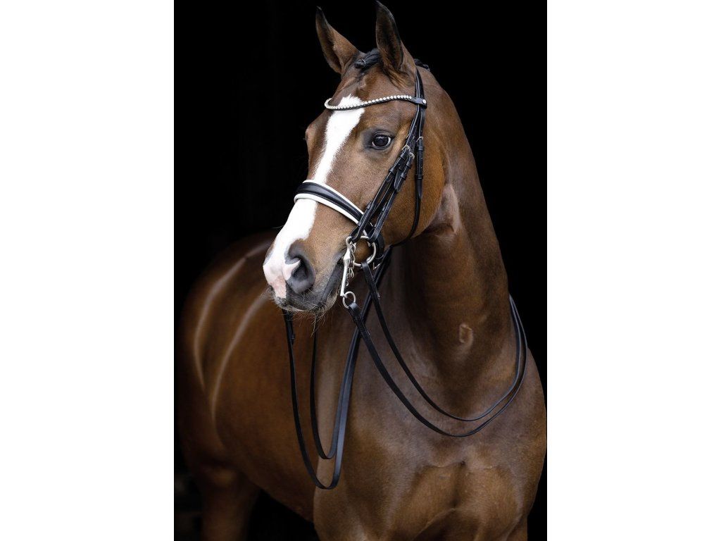 Vysoce kvalitní drezurní uzda vyrobená z kůže. Vybavena měkce polstrovaným nánosníkem a nátylníkem. Opatřena zapínáním na háčky a kováním ve stříbrné barvě. Nánosník měří v nejširším místě cca 4,5 cm. Čelenka zdobená lesklými kamínky. Dodávána včetně dvou párů kožených otěží. Ve velikostech Pony, Cob a Full.