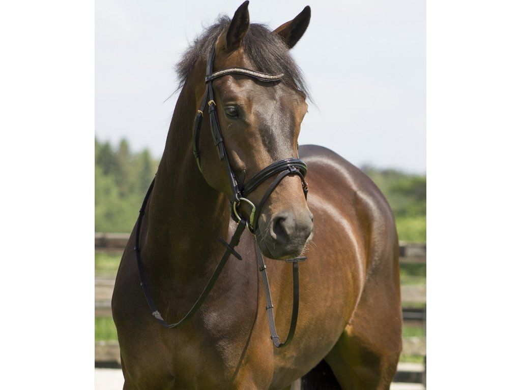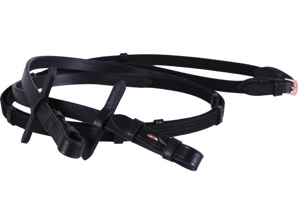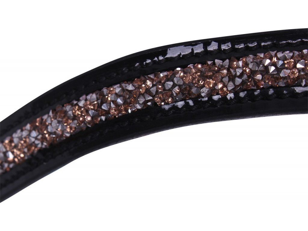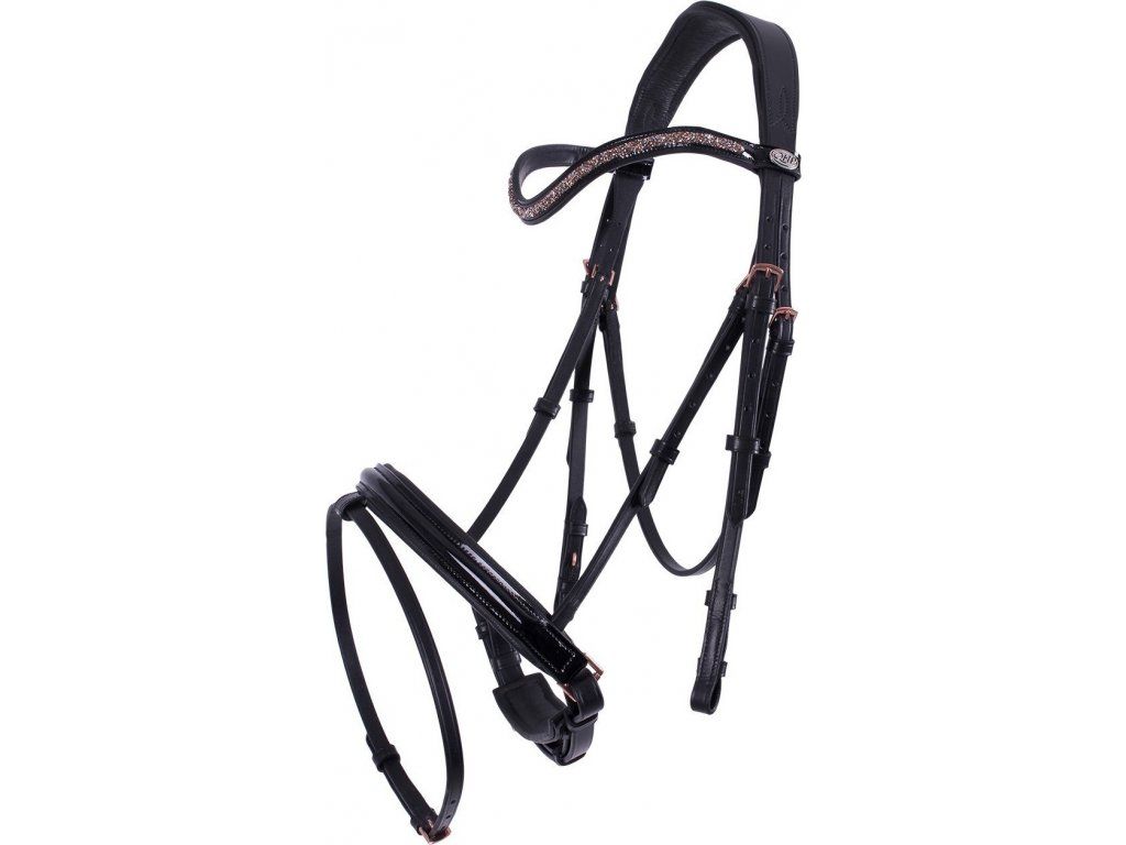 Kvalitní kožená uzdečka Amor se švédským kombinovaným nánosníkem z patentované kůže. Uzdečka vyniká díky krásným detailům z růžového zlata. Třpytivá čelenka ve tvaru vlny je vyplněna růžovými a zlatými kamínky. Dodávána včetně otěží. V černém provedení.