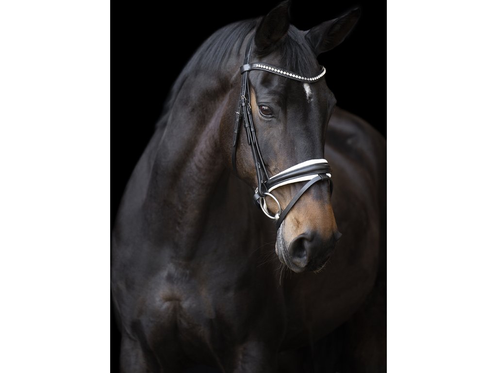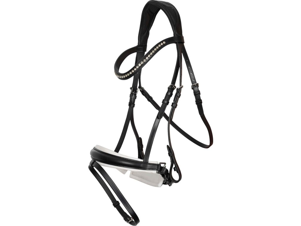 Kvalitně zpracovaná kožená uzdečka nabízí ideální rovnováhu mezi elegancí a komfortem. Je vybavena anatomicky tvarovaným nátylníkem a nánosníkem švédského typu, které jsou měkce polstrované pro maximální komfort koně. Čelenka je zdobena decentními kamínky a kontrastní polstrování v oblasti nánosníku podtrhuje elegantní vzhled uzdečky. Uzdečka je vyrobena z kvalitní kůže s polstrováním z ovčí kůže, které zajišťuje mimořádnou měkkost. Dodávána je bez otěží.