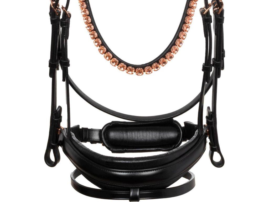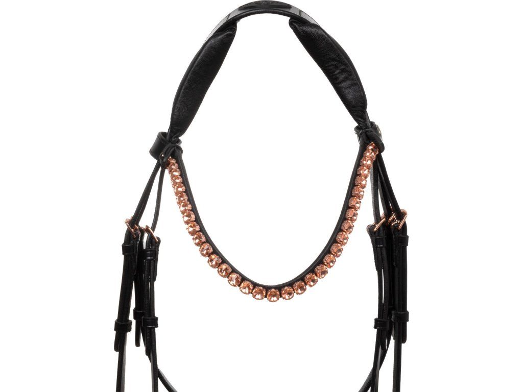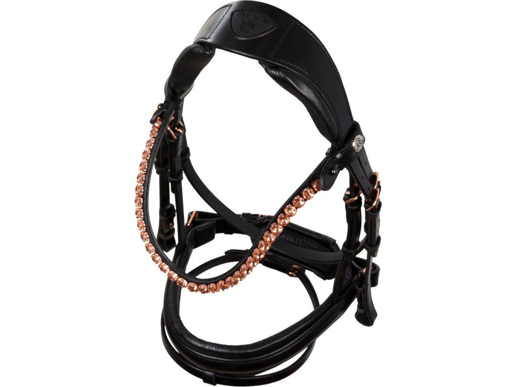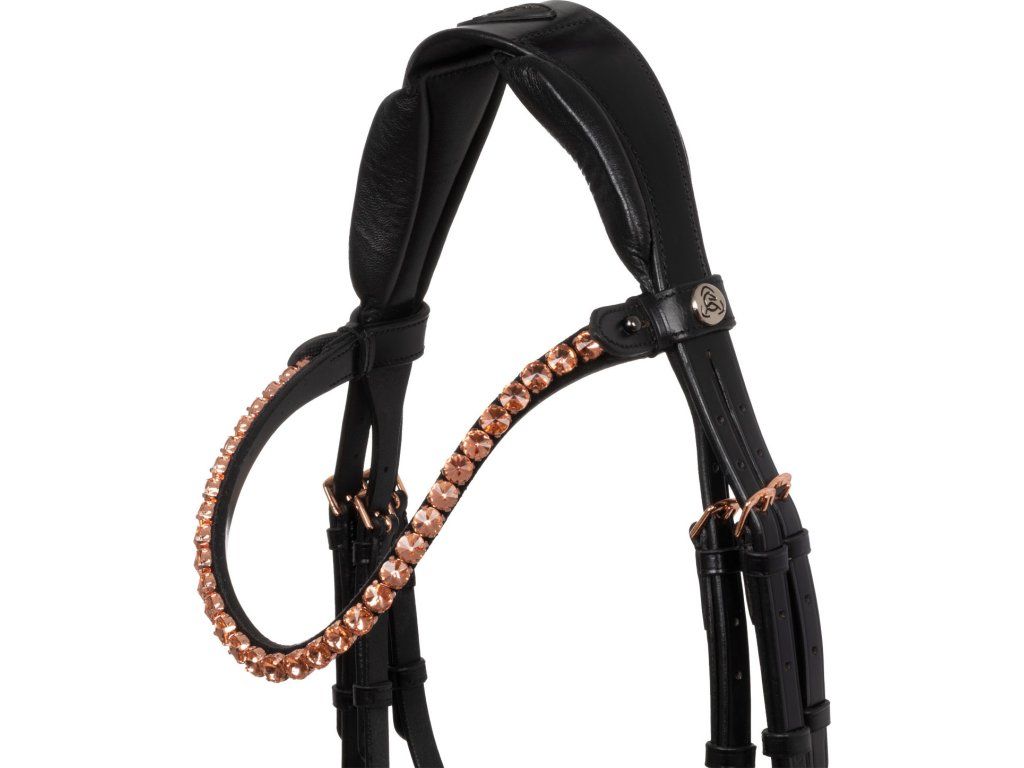 Tato uzdečka je kombinací stylu, funkčnosti a řemeslného zpracování, která uspokojí i ty nejnáročnější jezdce. Je symbolem elegance a prestiže. Vyrobena z nejkvalitnější italské kůže. Byla speciálně navržena tak, aby vašemu koni poskytla maximální pohodlí a mimořádně sofistikovaný styl. Pružný a anatomický nátylník díky bočním latexovým polštářkům zmírňuje tlak v oblasti lebky koně a zajišťuje pohodlné a neomezené nošení. Tvarovaný a polstrovaný latexový nánosník nabízí inovativní design díky použití lesklé kůže uprostřed, která uzdečce dodává nádech elegance a modernosti. Tato jednoduchost nabízí sofistikovaný vzhled v sedle. Čelenka je zdobena kamínky v barvě růžového zlata. Rosegold přezky z nerezové oceli zaručují odolnost a bezpečné zapínání.