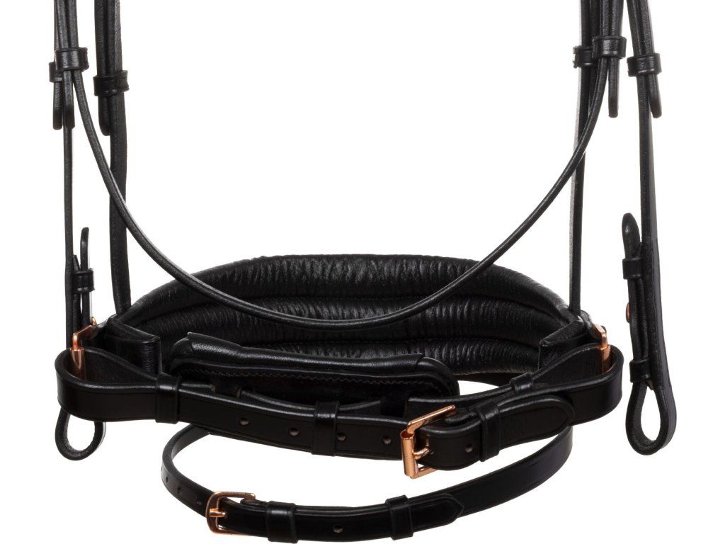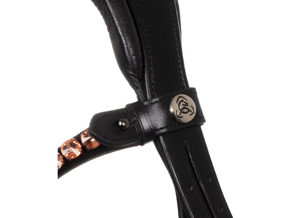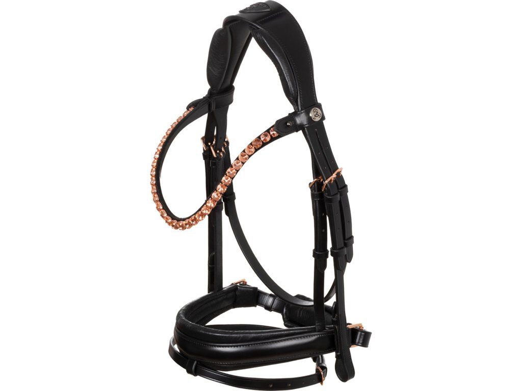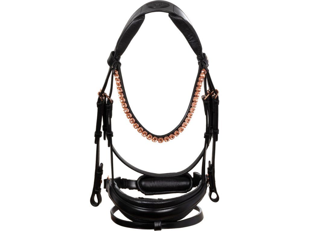 Tato uzdečka je kombinací stylu, funkčnosti a řemeslného zpracování, která uspokojí i ty nejnáročnější jezdce. Je symbolem elegance a prestiže. Vyrobena z nejkvalitnější italské kůže. Byla speciálně navržena tak, aby vašemu koni poskytla maximální pohodlí a mimořádně sofistikovaný styl. Pružný a anatomický nátylník díky bočním latexovým polštářkům zmírňuje tlak v oblasti lebky koně a zajišťuje pohodlné a neomezené nošení. Tvarovaný a polstrovaný latexový nánosník nabízí inovativní design díky použití lesklé kůže uprostřed, která uzdečce dodává nádech elegance a modernosti. Tato jednoduchost nabízí sofistikovaný vzhled v sedle. Čelenka je zdobena kamínky v barvě růžového zlata. Rosegold přezky z nerezové oceli zaručují odolnost a bezpečné zapínání.