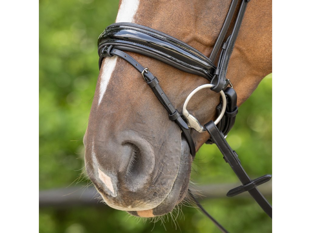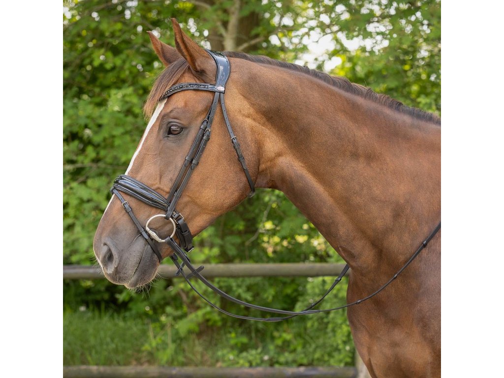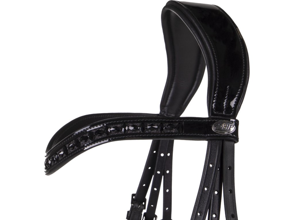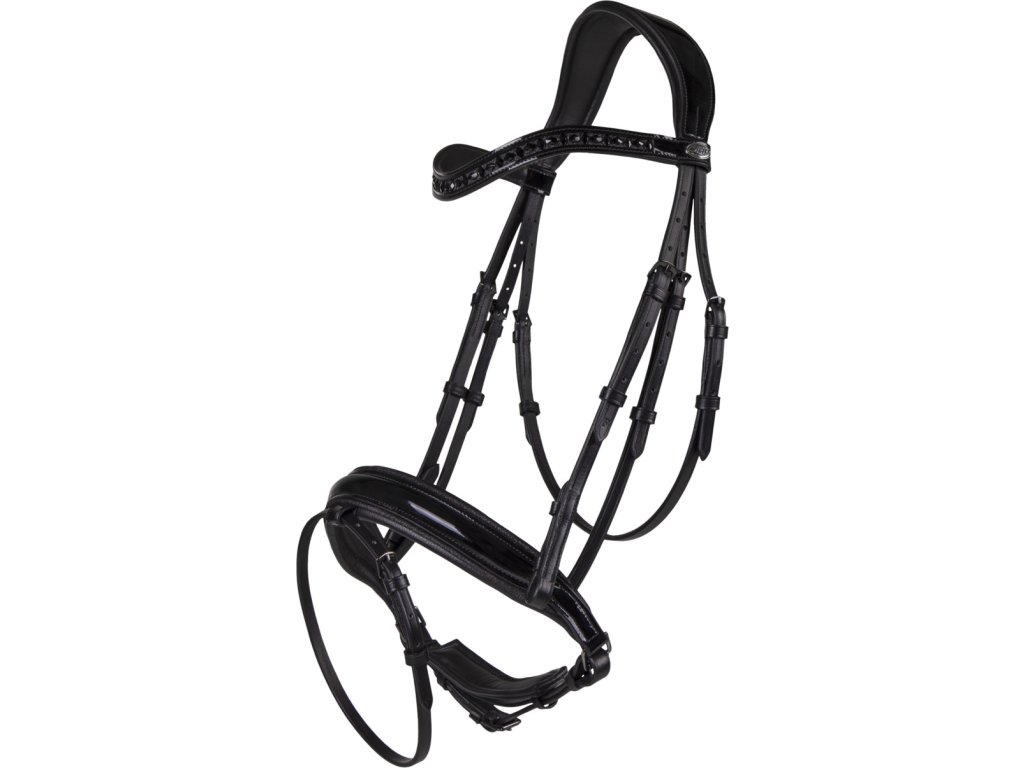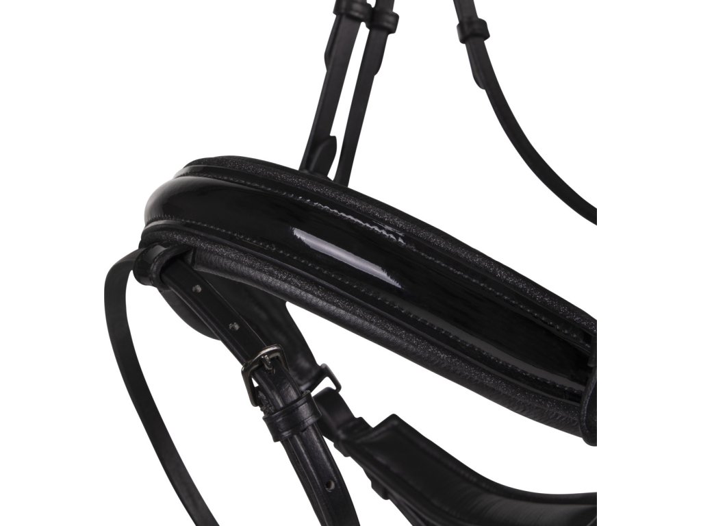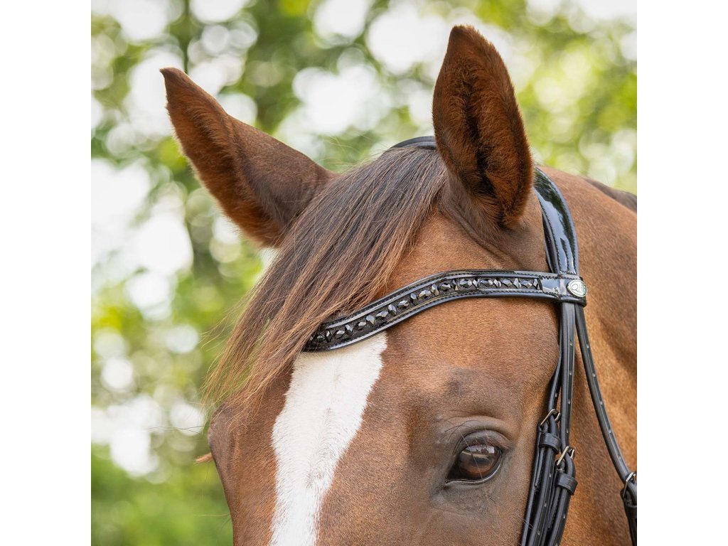 Uzdečka z vysoce kvalitního koženého materiálu nabízí perfektní kombinaci elegance a pohodlí. Opatřena je anatomicky tvarovaným nátylníkem a lakovaným nánosníkem s měkkým polstrováním. Uzdečka má nádhernou čelenku, která je z lakovaného materiálu s kamínky a třpytivými detaily. Je dodávána včetně otěží.