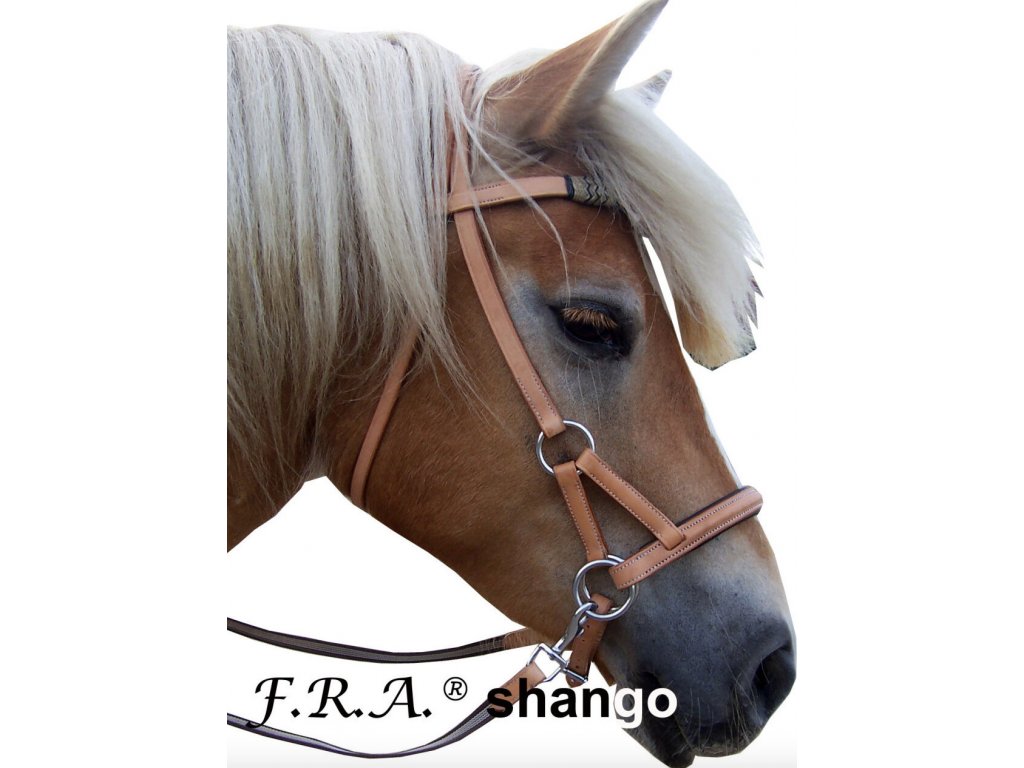 Bezudidlová westernová uzdečka Shango od značky F.R.A. je vyrobena z přírodní bůvolí kůže. Disponuje měkkým polstrovaným kulovitým nánosníkem a čelenkou s ozdobným prvkem uprostřed. Tato uzdečka může napomoci ke zlepšení komunikace mezi koněm a jezdcem. Společně s uzdečkou jsou dodávány protiskluzové otěže s karabinkami. Veškerá kování na uzdečce jsou ve stříbrné barvě. V rámci bezudidlového diagramu F.R.A. spadá pod číslo 3. Je vhodná zejména u citlivých a mladých koní, kteří se s uzdečkou teprve seznamují či mají problém s přijímáním udidla.