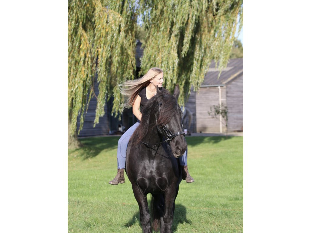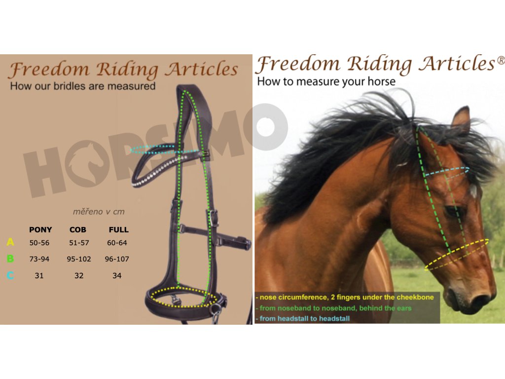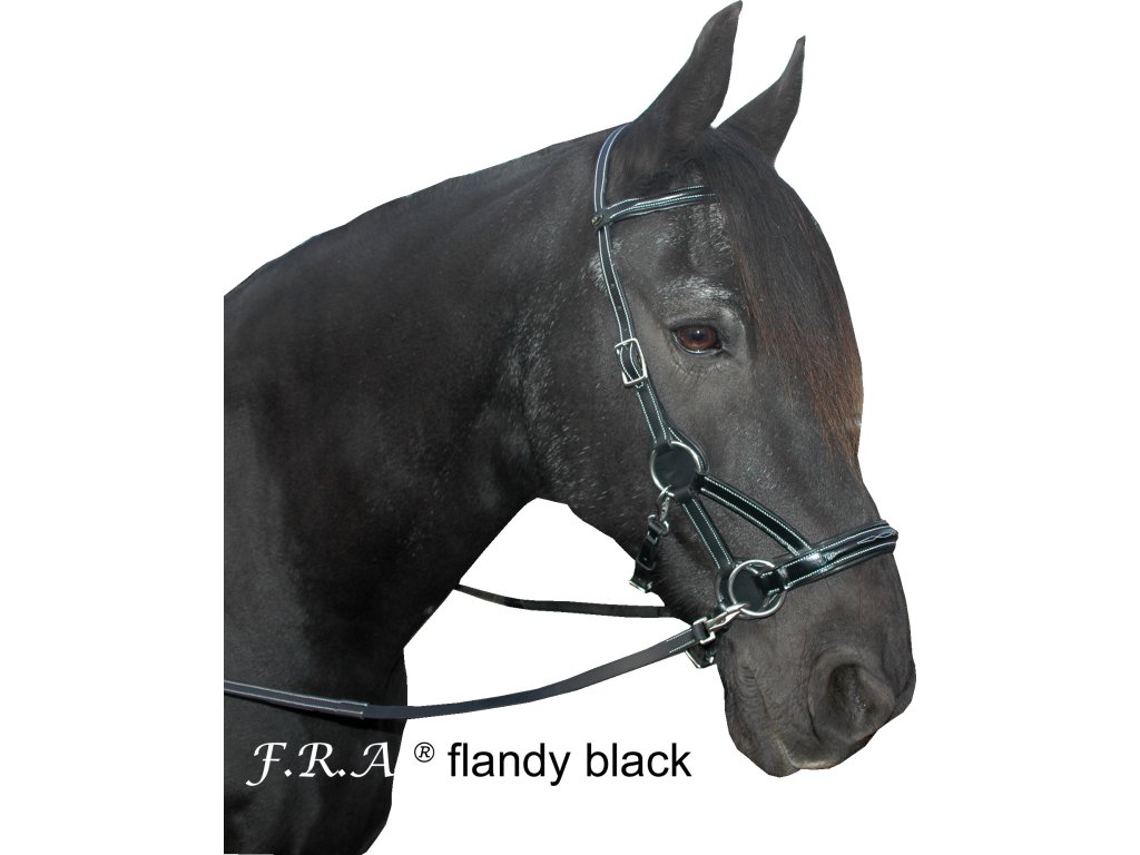 Sidepull uzdečka Flandy F.R.A. je vyrobená z vysoce kvalitní anglické kůže a celá dekorativně prošitá bílou nití. Na nánosníku a čelence jsou vyšity ornamenty. Dále je vybavena nerezovými přezkami, které jsou vypodloženy. Tento sidepull má velmi pevný tvar, který drží na svém místě a všechny řemínky jsou nastavitelné. Dodávané včetně otěží s gripem a karabinkou. V rámci bezudidlového diagramu F.R.A. spadá pod číslo 3.