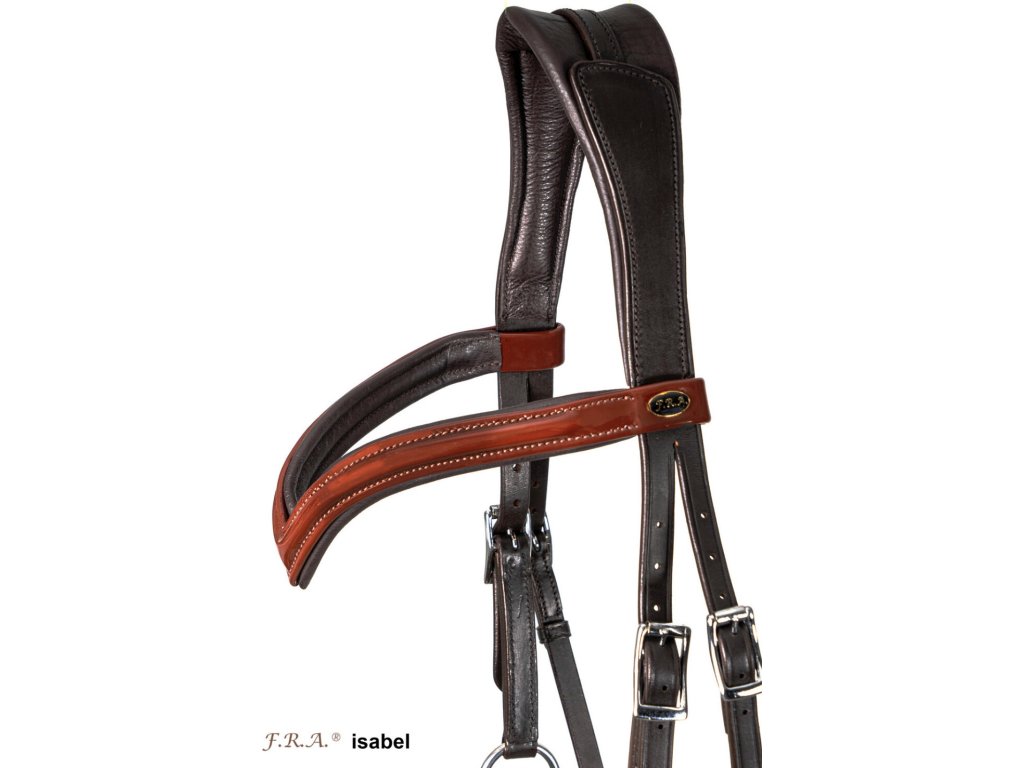 Bezudidlová sidepull uzdečka Isabel od značky F.R.A. Uzdečka je vyrobena z kvalitní kůže a zdobena lakovanou kůží v oblasti čelenky a nánosníku, čelenka je tvarovaná do V tvaru, to dodává uzdečce elegantní vzhled. Nátylník uzdečky je anatomicky tvarovaný a měkce polstrovaný. Zápínání u nánosníku je měkce polstrované, eliminuje se tak riziko odření koně. Veškeré kování na uzdečce je ve stříbrné barvě. Společně s uzdečkou jsou dodávány také otěže z měkké kůže s karabinkami. V rámci bezudidlového diagramu F.R.A. spadá pod číslo 3. Tato uzdečka je vhodná pro citlivé a mladé koně, či pro koně, kteří mají problém s přijímáním udidla.