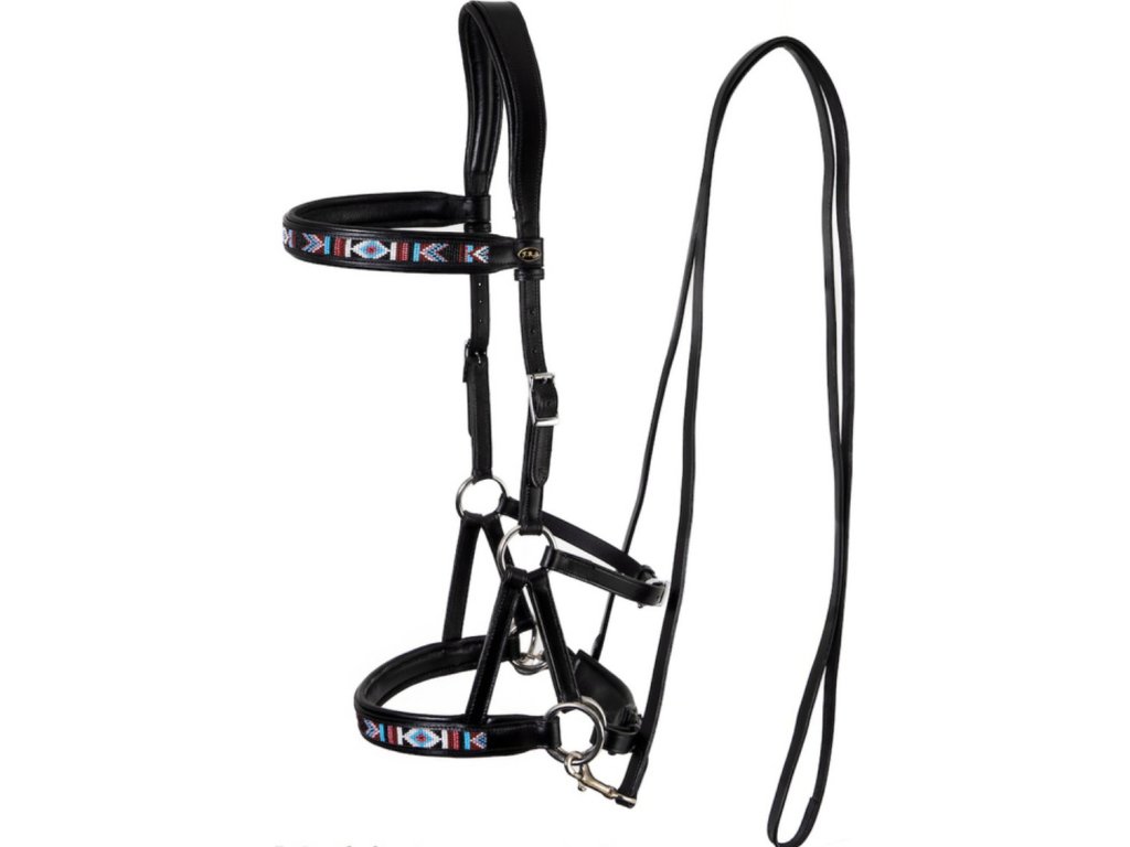 Kvalitní bezudidlová uzdečka Sidepull Sierra vyrobená z pravé kůže. Uzdečka je zdobena barevnými detaily na nánosníku a čelence a doplněna kováním ve stříbrné barvě. Nánosník, čelenka i nátylník mají měkké polstrování pro maximální pohodlí koně. Součástí balení jsou i protiskluzové otěže s karabinami. V bezudidlovém diagramu F.R.A. spadá tento typ pod stupeň 3.