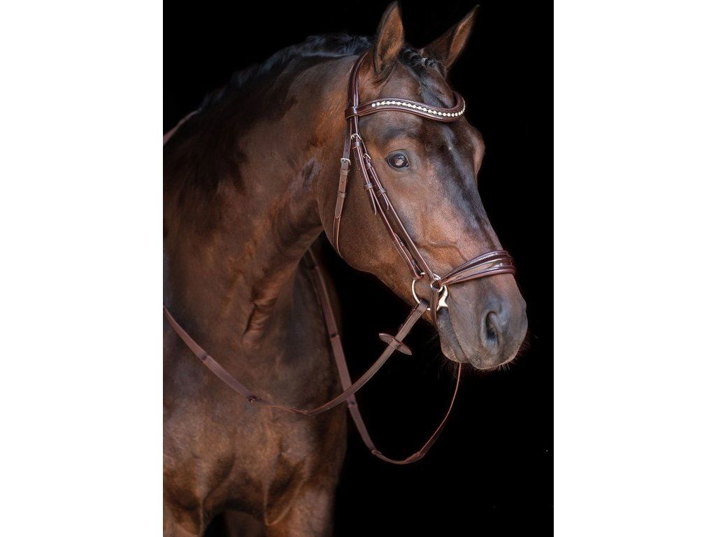 Vysoce kvalitní uzdečka s hannoverským nánosníkem vyrobená z hovězí kůže. Opatřena kováním ve stříbrné barvě. Nánosník, nátylník a čelenka měkce polstrované. Čelenka zdobena lesklými kamínky. Součástí jsou plátěné otěže s koženými zarážkami. Dostupná ve více barvách. Ve velikostech Pony, Cob a Full.